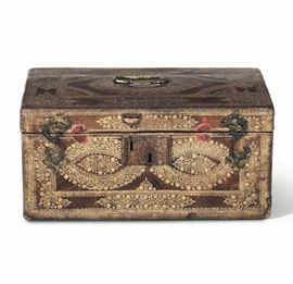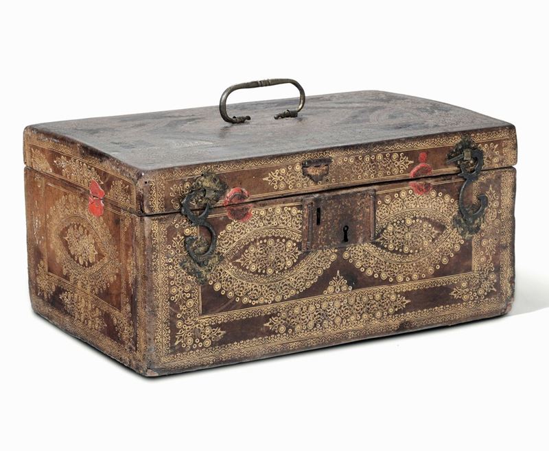 Cassetta da viaggio. Cuoio con impressioni in oro e finimenti in bronzo. Arte del XVIII secolo