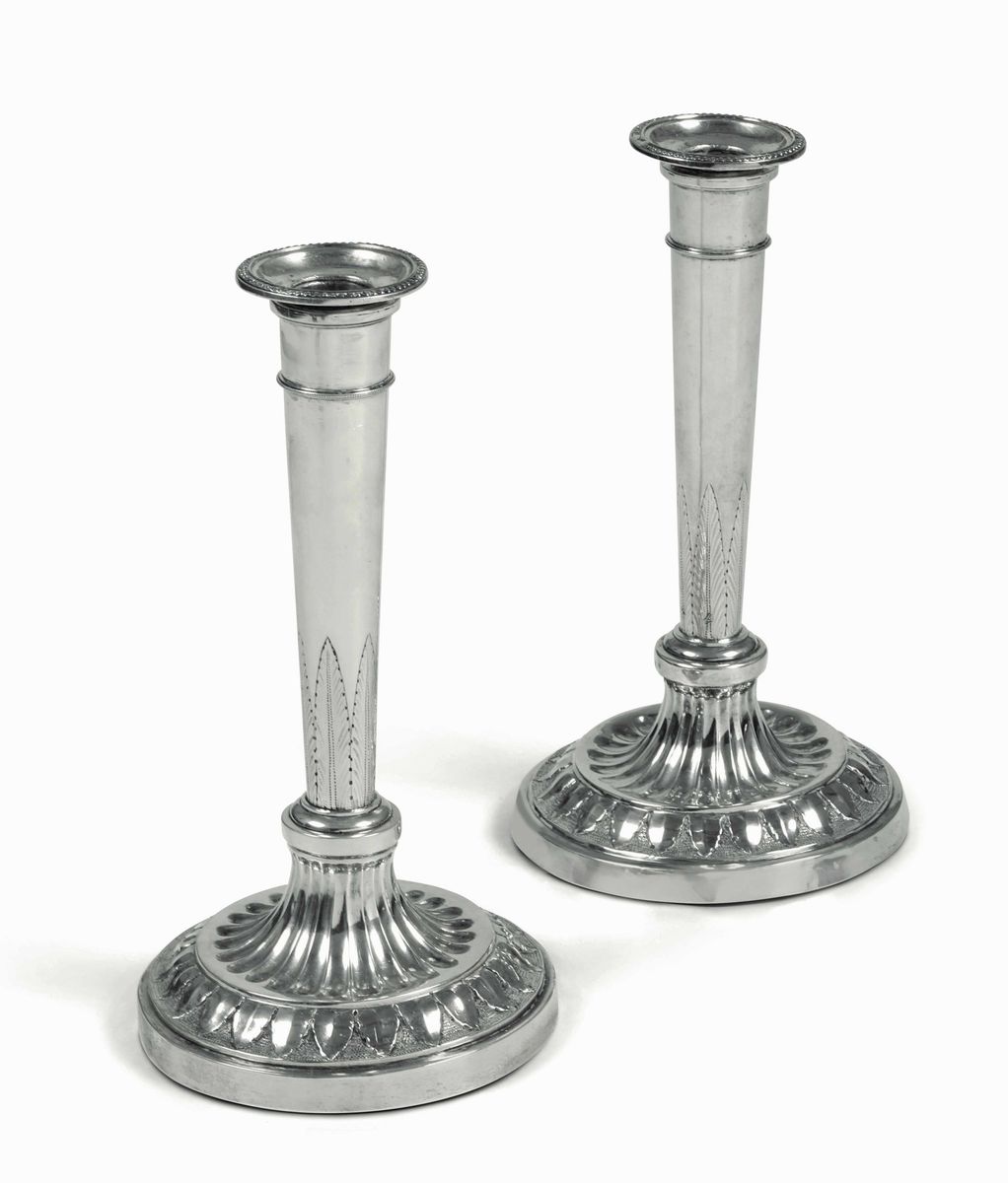 Coppia di candelieri in argento fuso, sbalzato e cesellato. Roma, inizio del XIX secolo Mastro argentiere Pietro Paolo Spagna (1793-1861) (?)