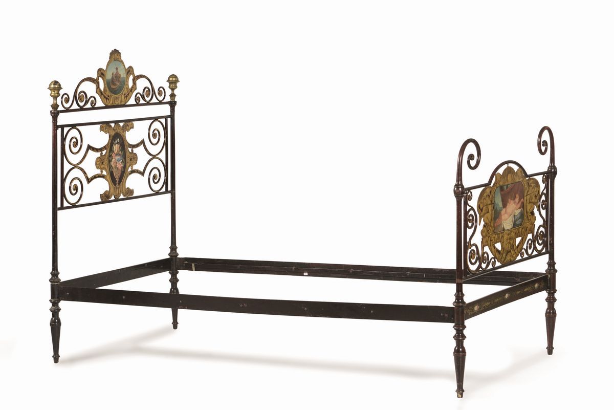 Coppia di letti in ferro battuto laccati e decorati con paesaggi e fiori, XVIII secolo