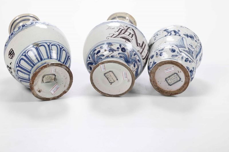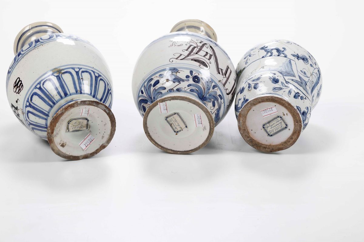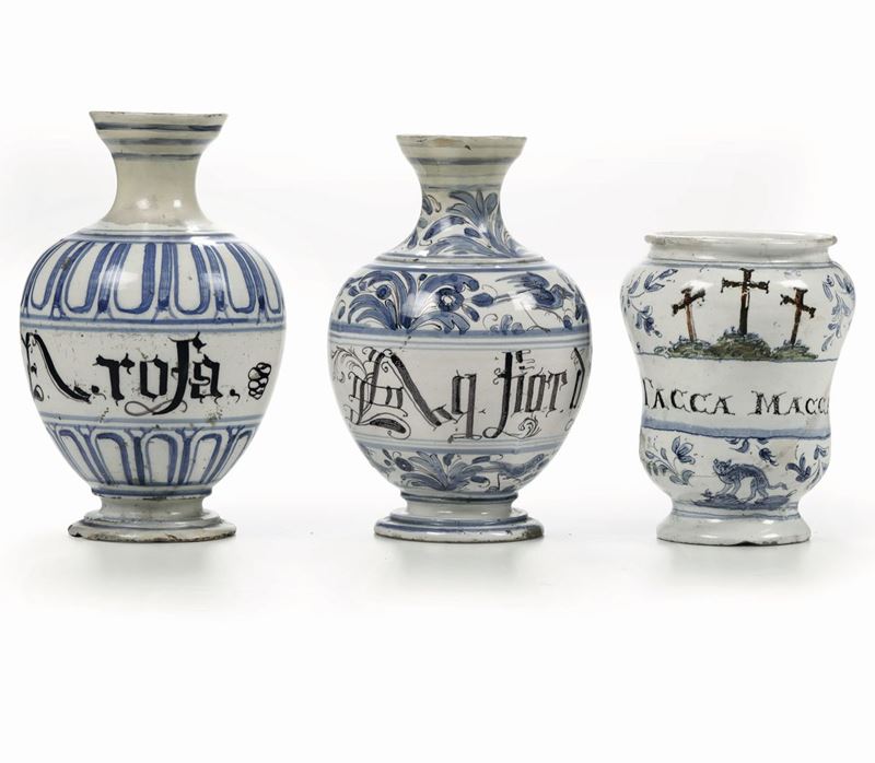 Due bottiglie da farmacia e un albarello Italia del nord, area veneta e liguria, XVIII secolo e inizio XX secolo