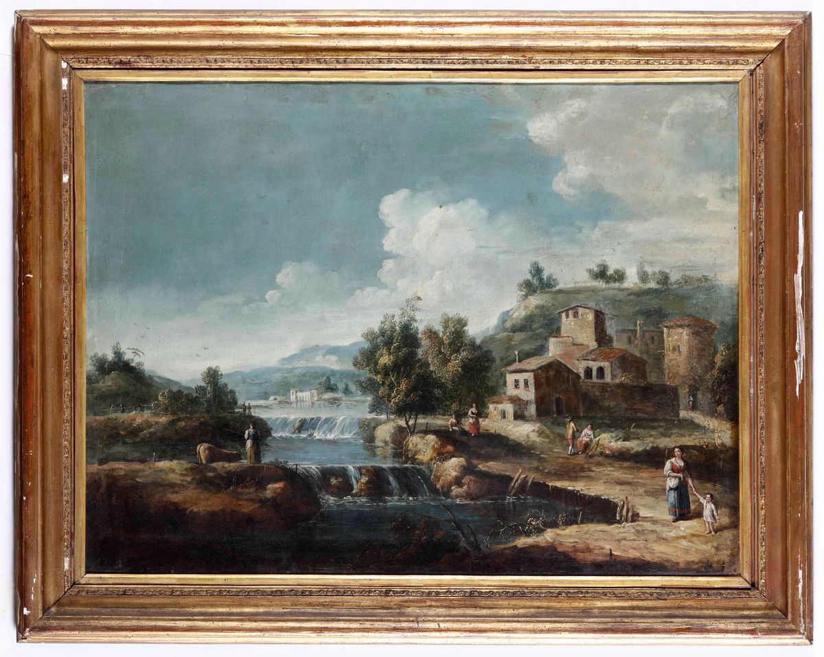 Giovan Battista Cimaroli (Salò 1687 - Venezia 1753), attribuito a Paesaggio con contadini e viandanti in riva al fiume
