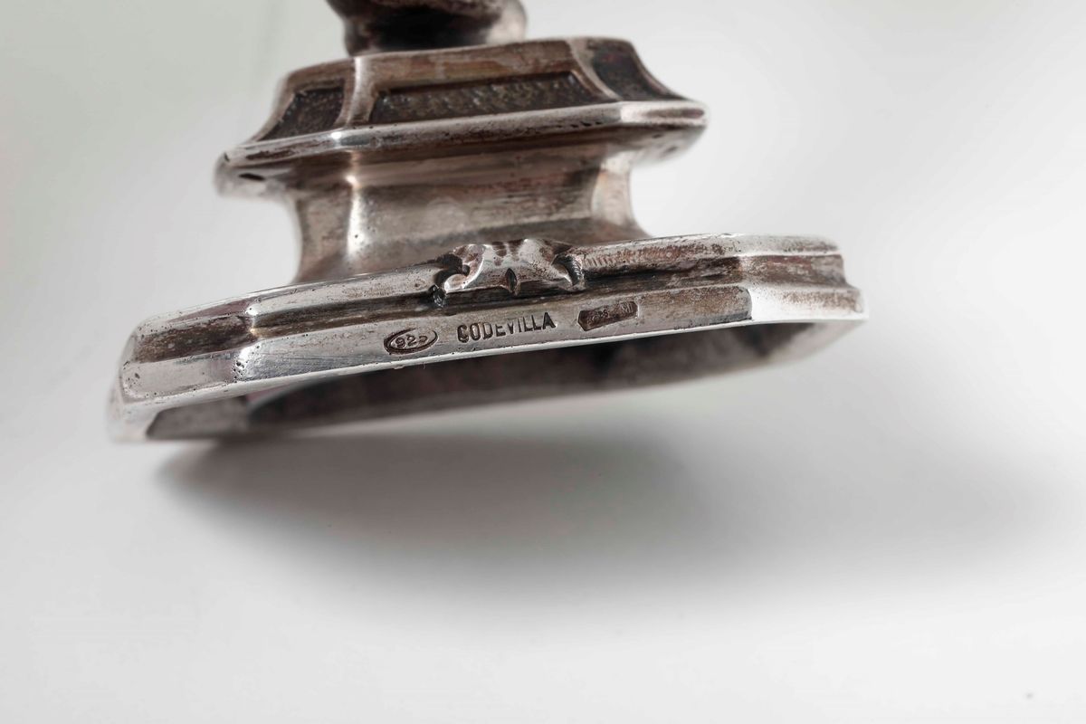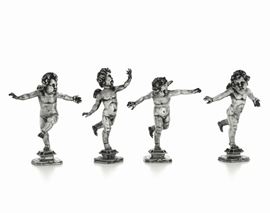 Gruppo di quattro putti danzanti in argento sterling fuso e cesellato. Argenteria artistica italiana del XX secolo