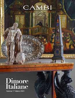 base a tre gambe arcuate terminanti con piede caprino, alzata a due ante e vani a giorno sulla sommità; decori policromi raffiguranti scene galanti entro paesaggi contornati da riserve dorate a motivo di ramages, volute e vasi di fiori cm 57x45x206