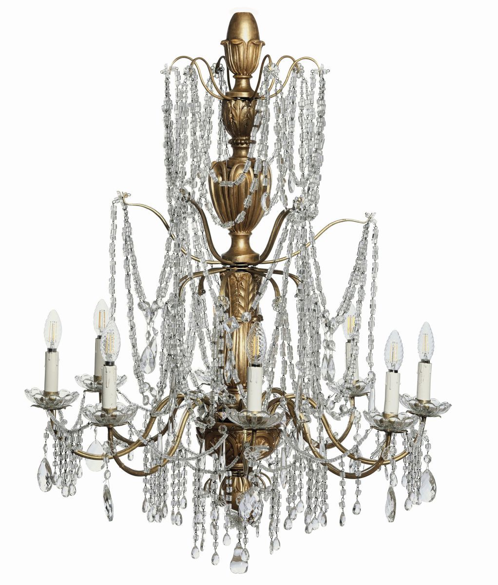 Lampadario a otto luci. Legno intagliato e dorato e cristalli. Fine XVIII secolo
