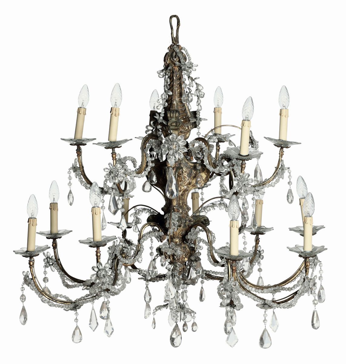 Lampadario Luigi XIV a quindici luci in legno intagliato e dorato, pendenti in cristallo, Genova XVIII secolo