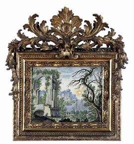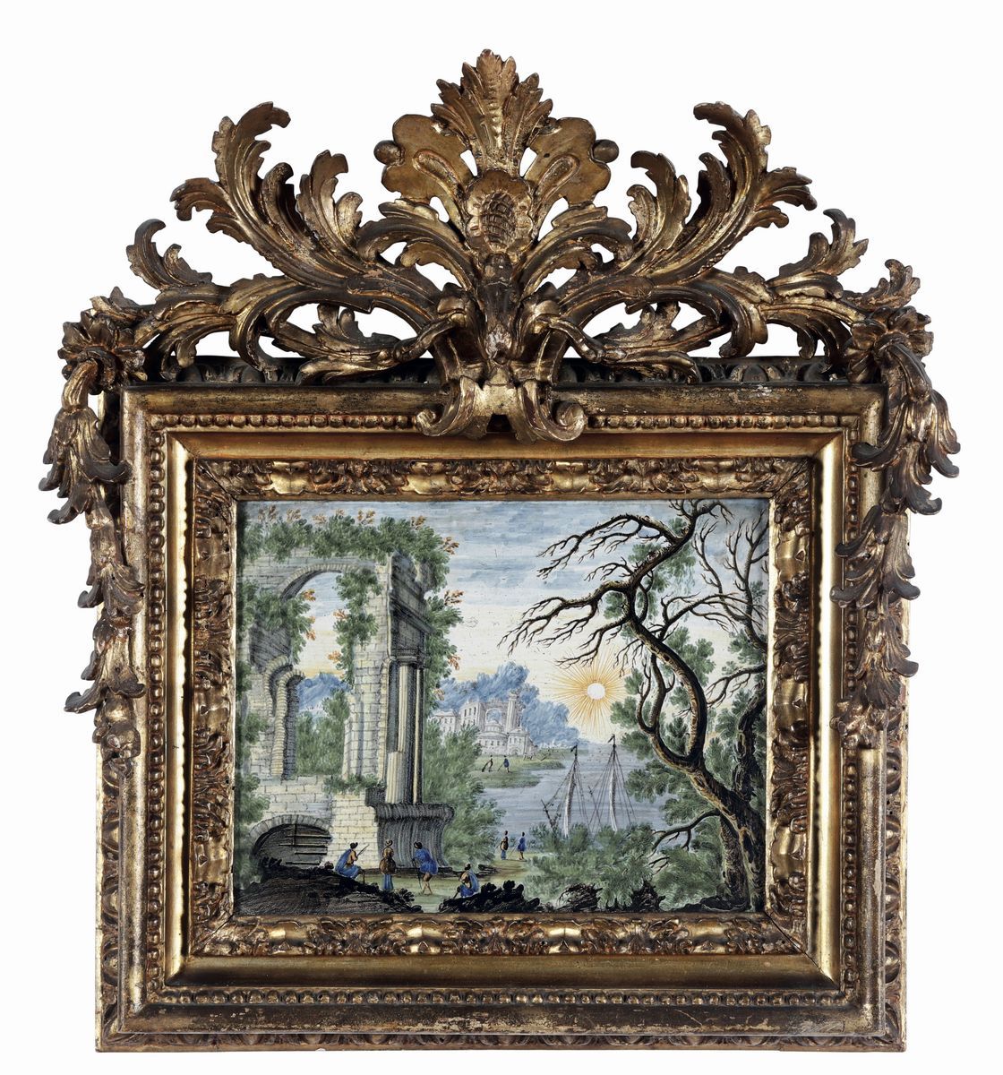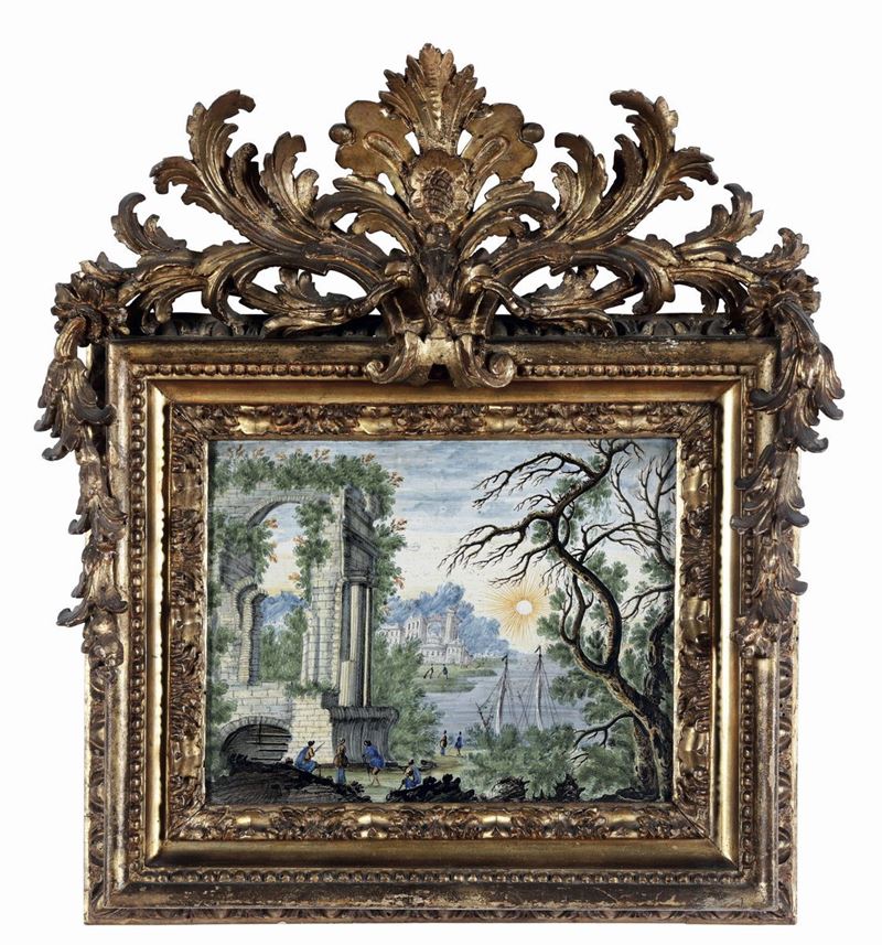 Questa bella mattonella è impreziosita da un’elegante cornice in legno dorato. La decorazione policroma a gran fuoco vede una rada con veliero in un paesaggio con alberi e rovine architettoniche classiche, animato da minuscole figure. In cielo un sole raggiante.
