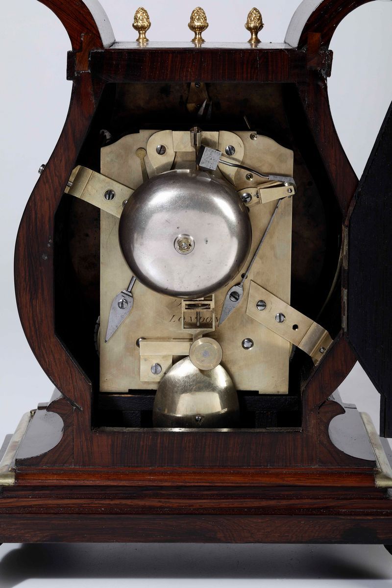 cm 31x24,5x38. Cassa in palissandro, quadrante in smalto con bronzo dorato, scappamento ad ancora suoneria delle ora