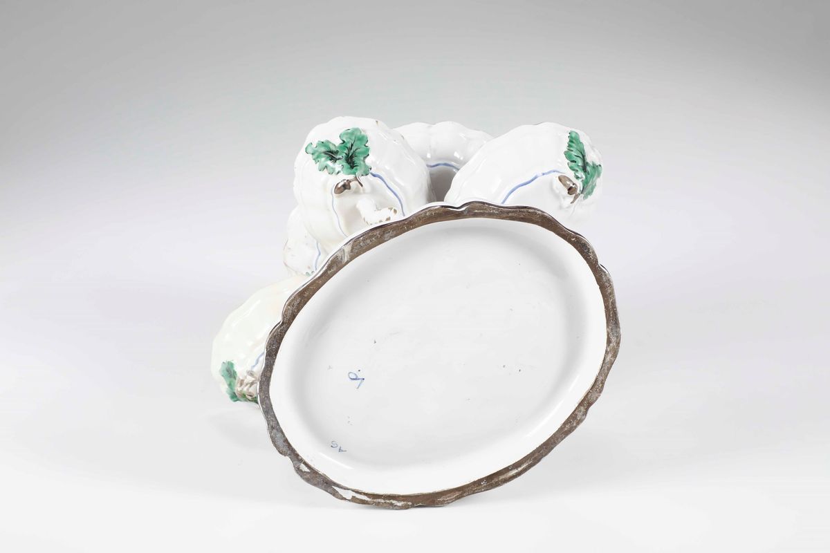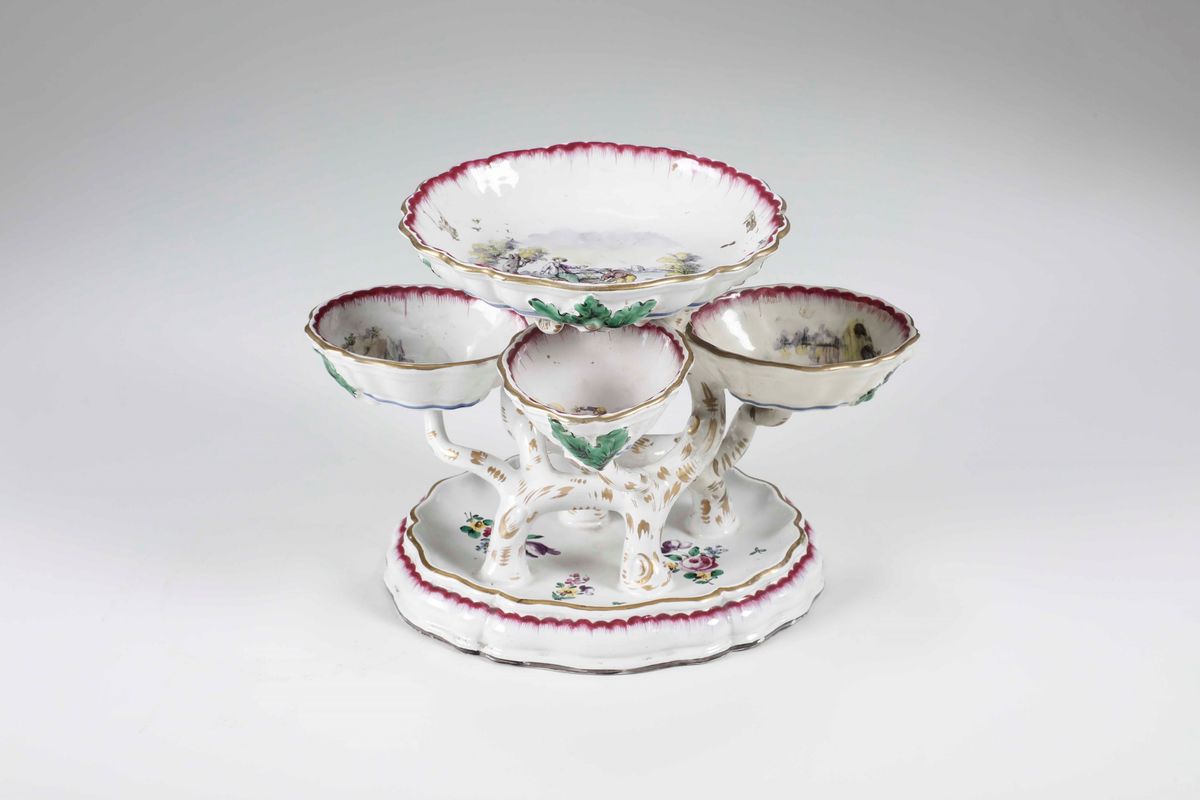 Maiolica. Marca: “VP” in blu quale pseudo marca di Marsiglia fabbrica Veuve Perrin. Altezza cm 20. Conservazione: una vaschetta e parte dell’albero circostante restaurati
