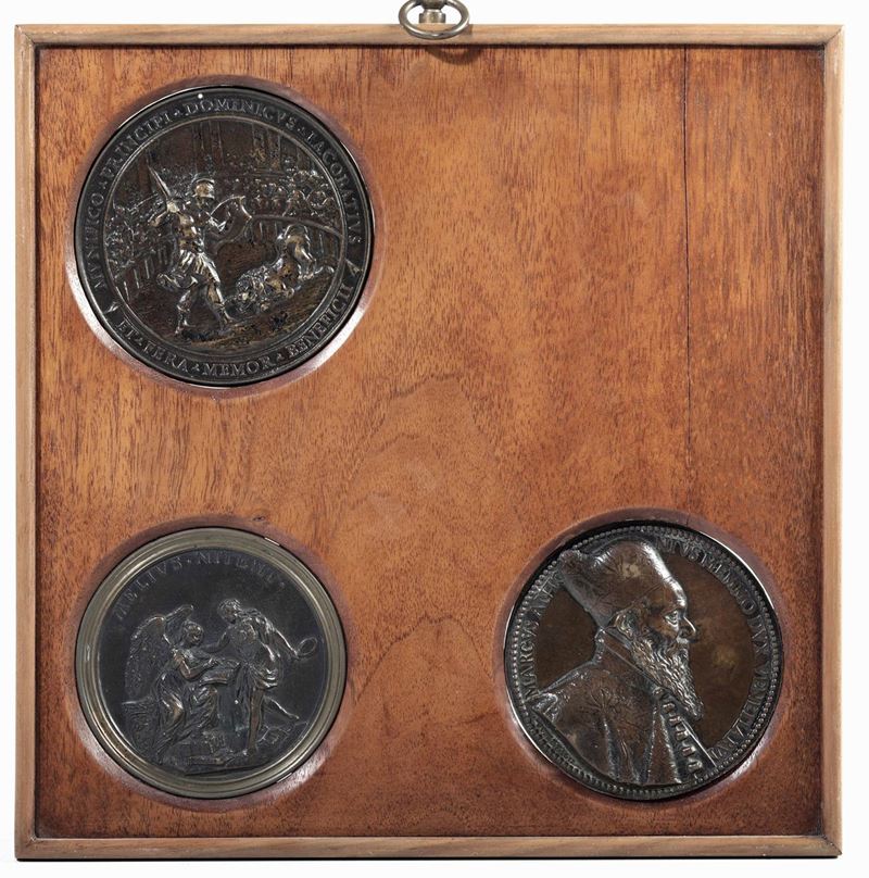 Quattro medaglie in bronzo, di cui due raffiguranti Urbano VIII, le altre due Alessandro VII e il canonico Gian Maria Mazzuchelli