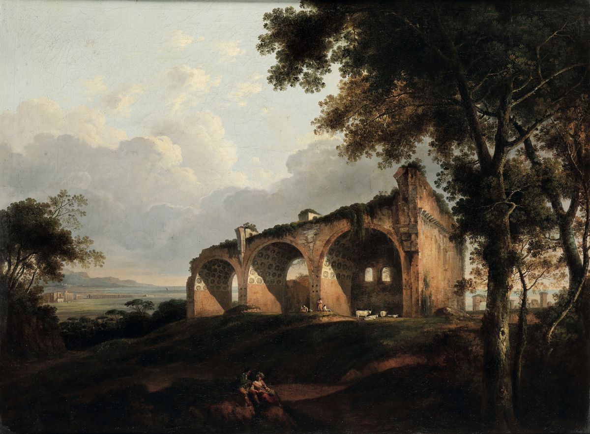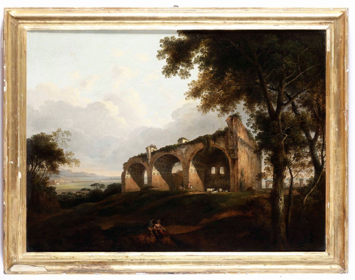 Scuola italiana del XVIII secolo Veduta con la basilica di Massenzio e pastori