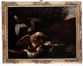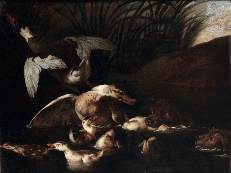 Scuola italiana del XVIII secolo Scena di caccia con cani e anatre