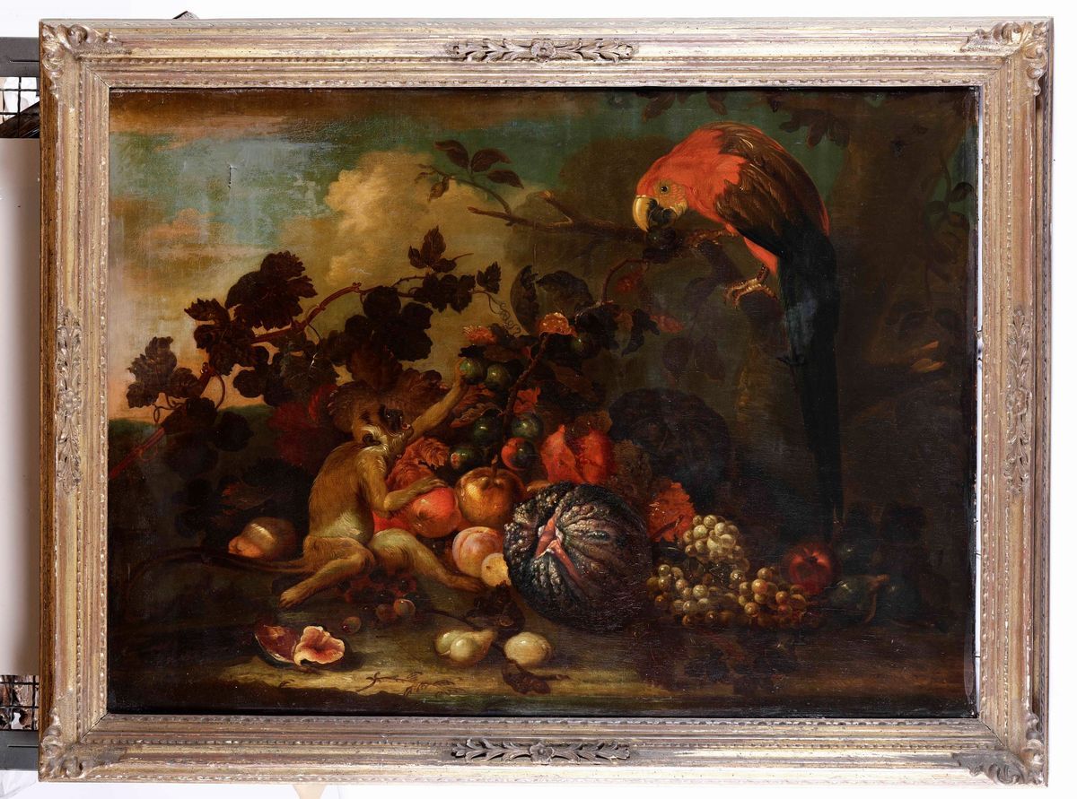 Scuola romana del XVII secolo Natura morta con scimmietta e pappagallo
