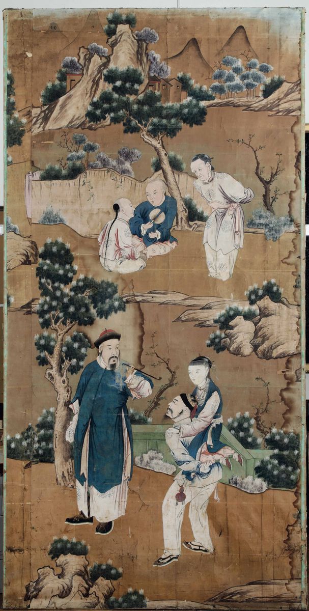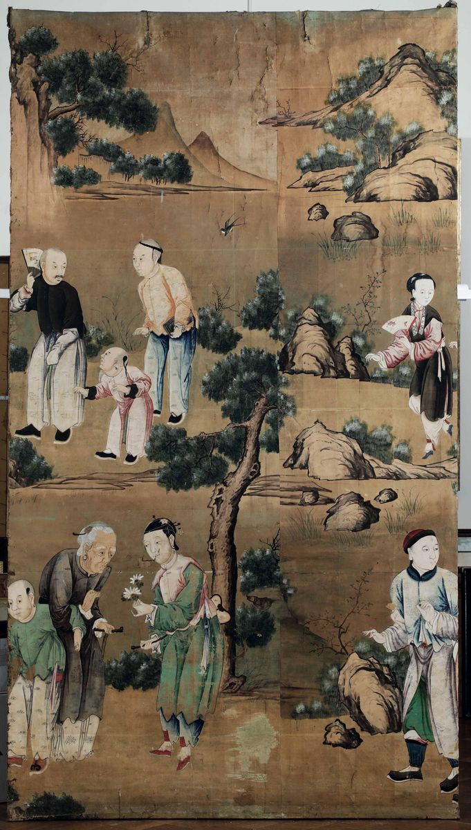 Tre grandi pannelli dipinti. Carta e acquerelli policromi. Cina dinastia Qing XVIII-XIX secolo