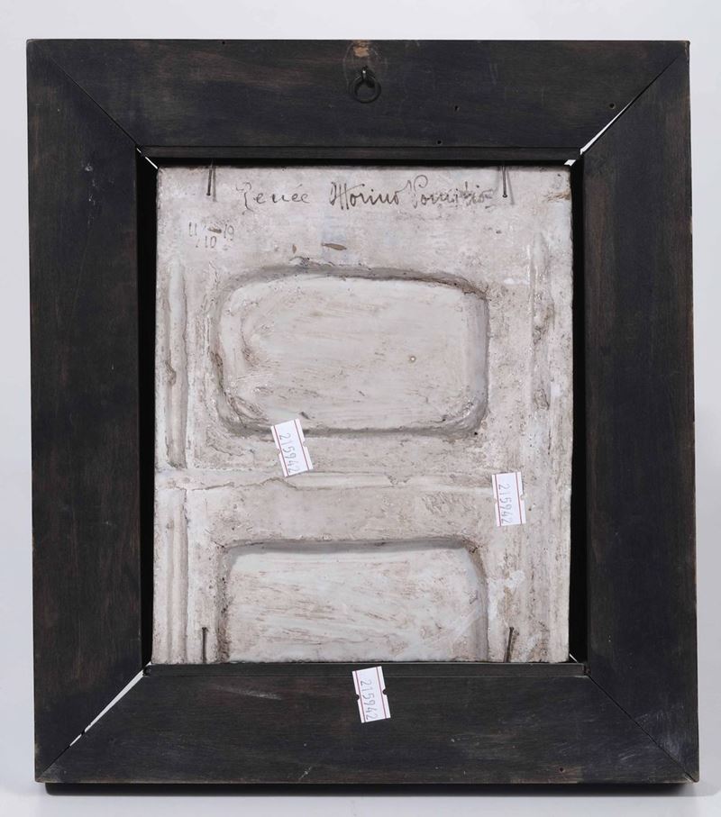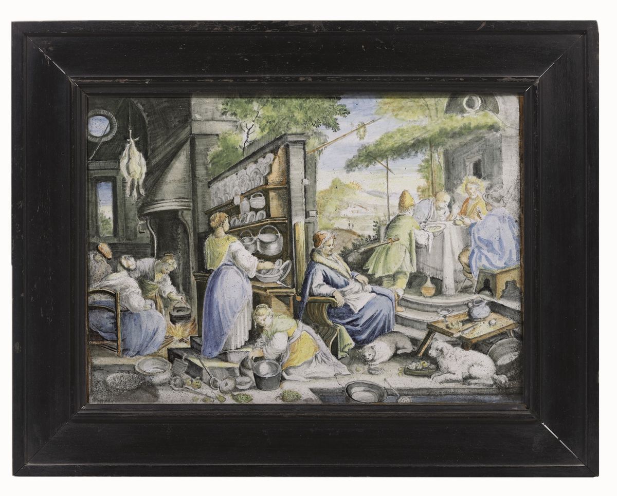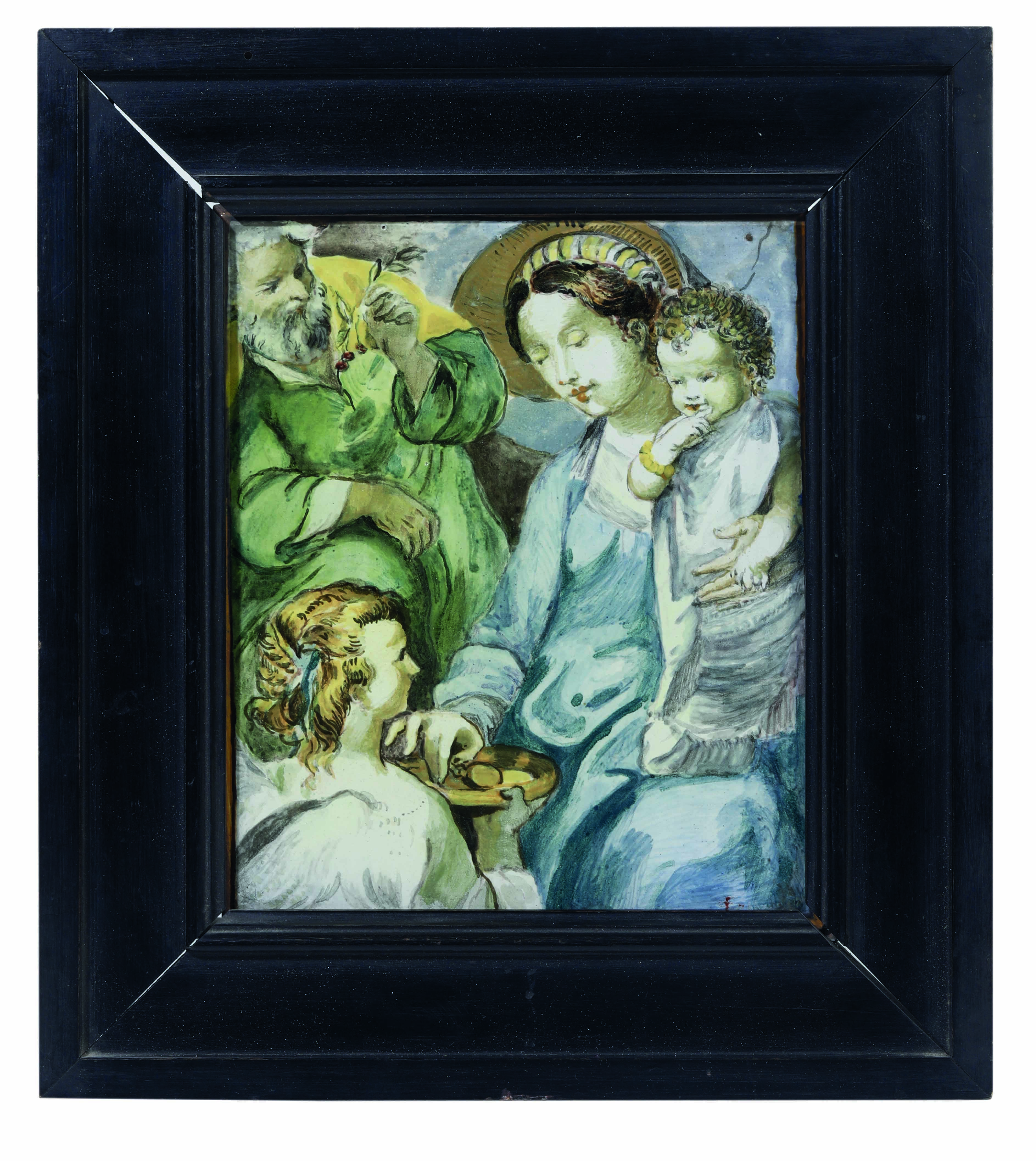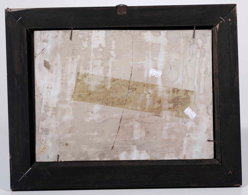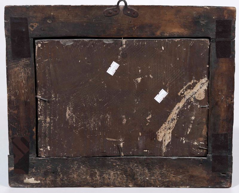 Maiolica. Dimensioni mattonelle: cm 22,7x31; cm 19,3x18,5; cm 20x17. Cornici in legno. Conservazione: la più piccola in ottimo stato; le altre due rotte e incollate