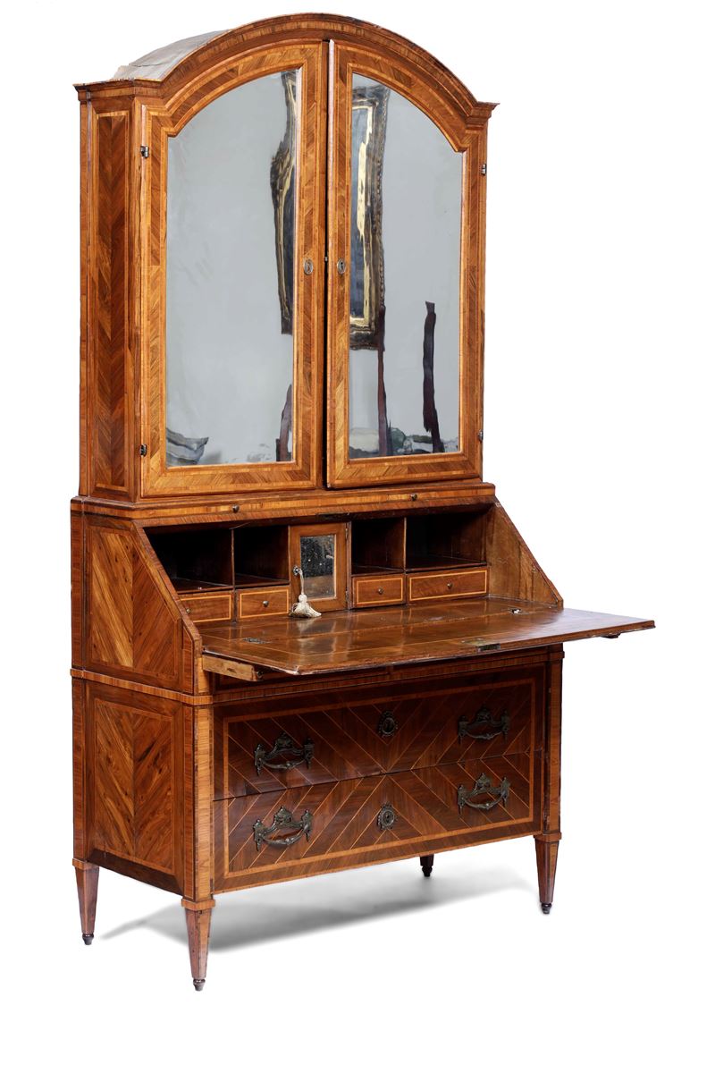 fronte e fianchi dritti, due cassetti più due affiancati sotto la calatoia contenente cassettini e vani portadocumenti, alzata a due ante a specchio, cm 122x60x242