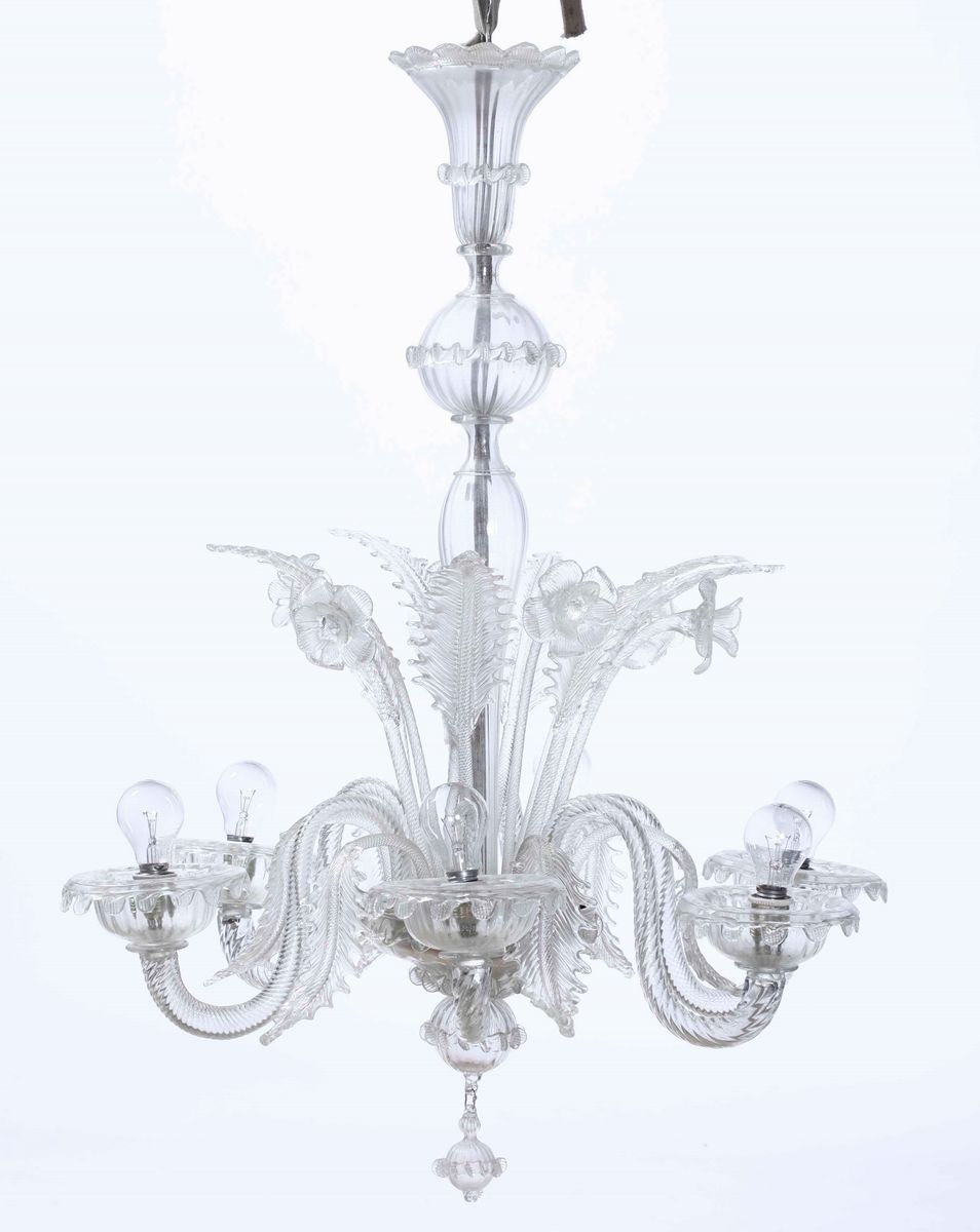 Lampadario a sei luci in vetro di Murano incolore, seconda metà XX secolo