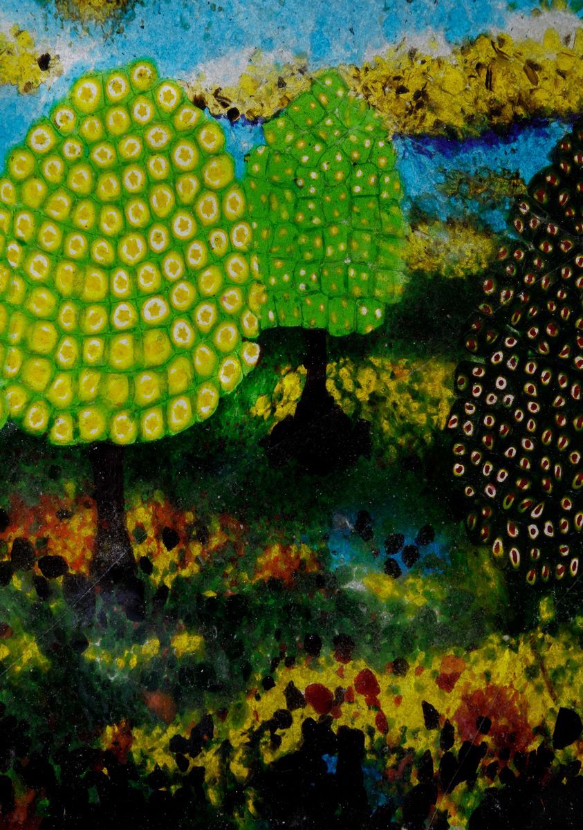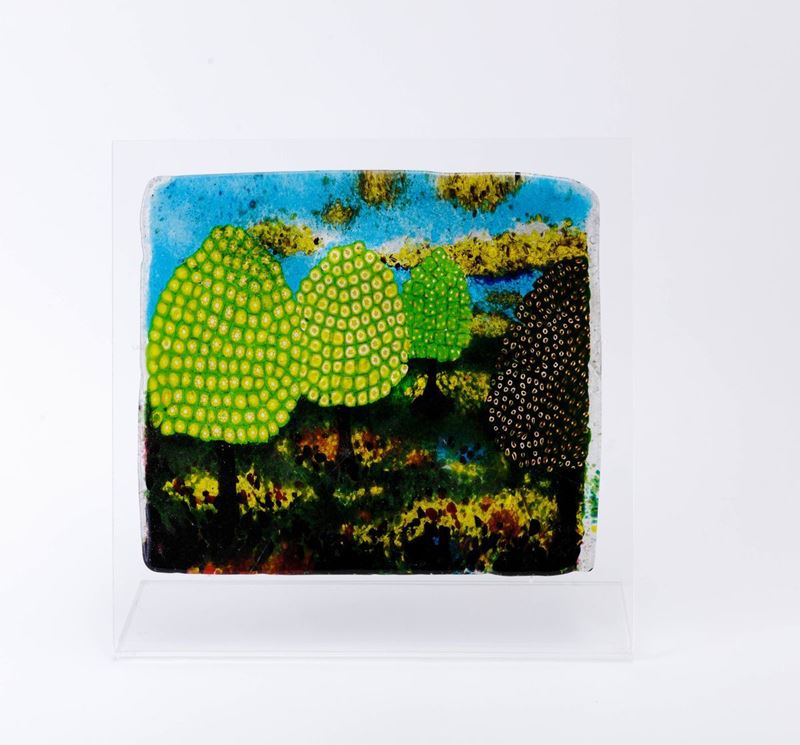 Vittorio Zecchin (1878-1947). A glass plaque with a decor of murrine and polychrome pate de verre depicting a landscape with trees. 28x25cm. Chippings and restorations.