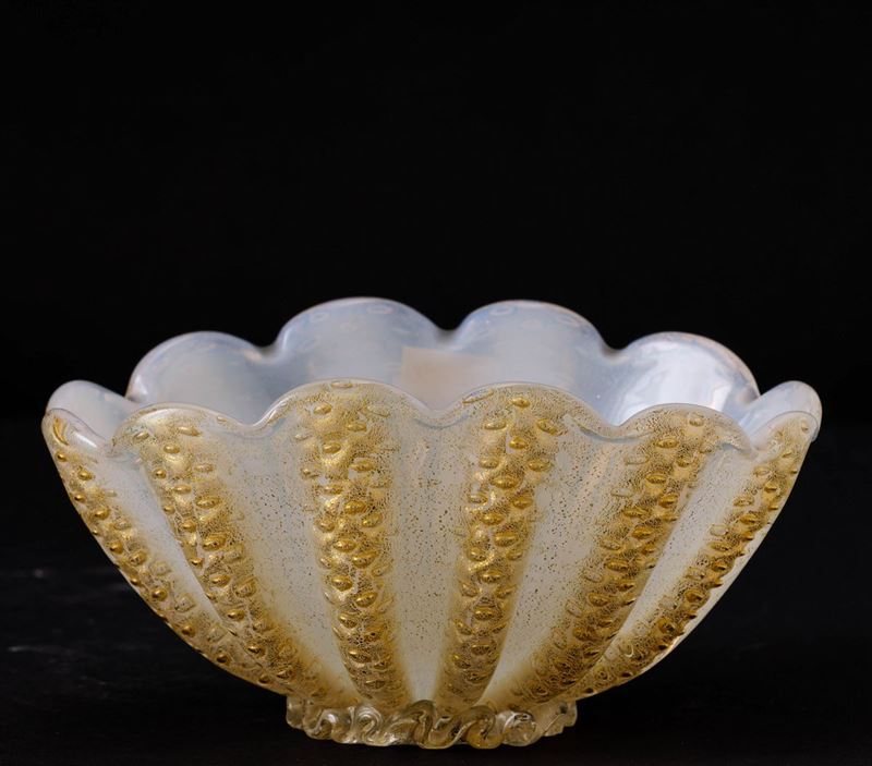 Ercole Barovier (1889-1972). A glass vase with gold ribs on an opaline backdrop. Applied coiled base. 22x16cm, H 11cm. Old label with serial number.