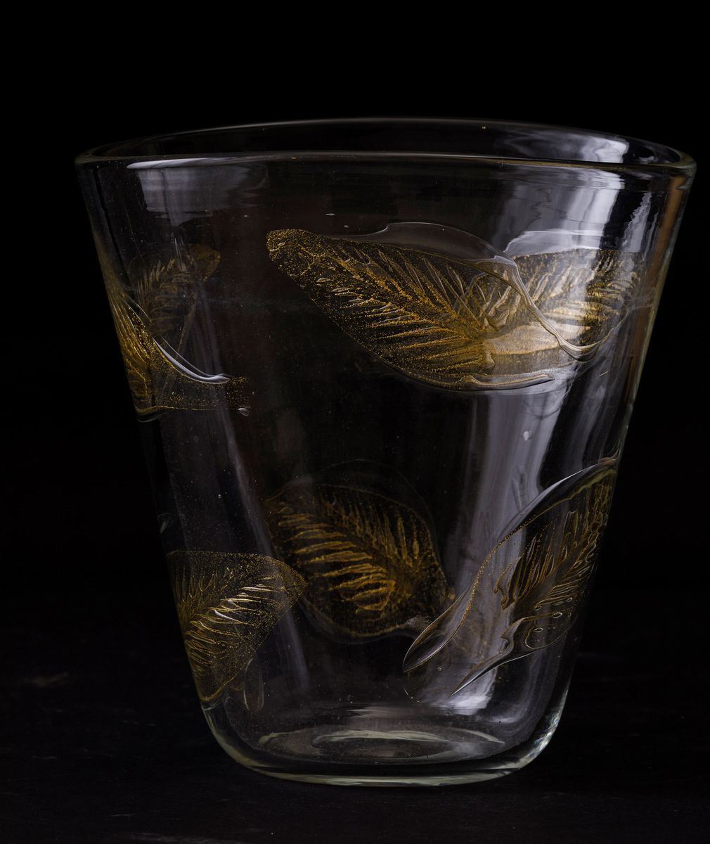 Ercole Barovier (1889-1972). A truncated cone-shaped vase from the Autunnale series in clear glass with blown glass leaves in corpo and a gold leaf decor. H 24cm, 23.5x15.5cm