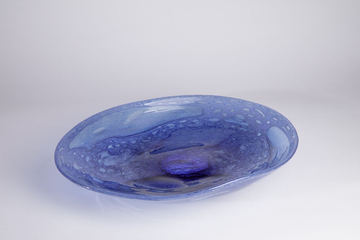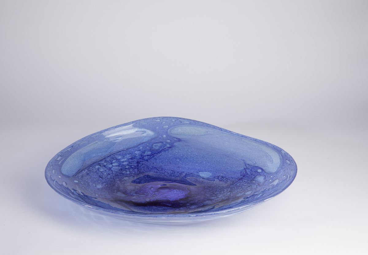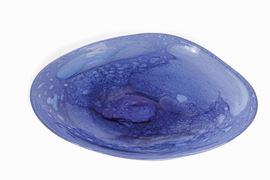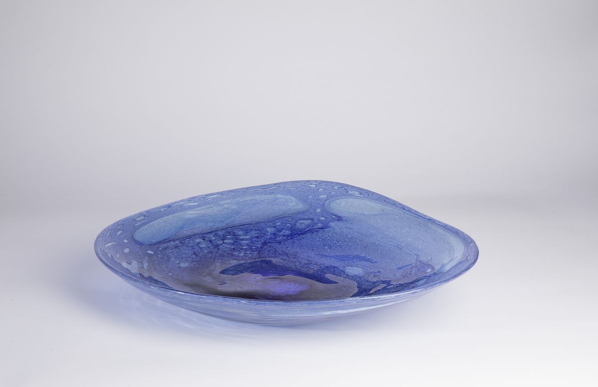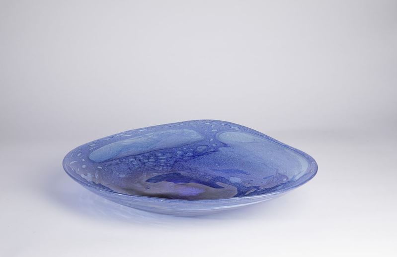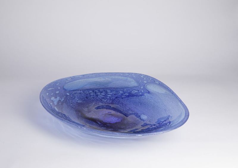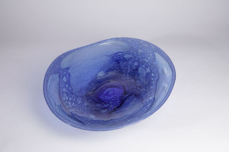 Ercole Barovier (1889-1972). An asymmetrical bowl from the Efeso series in blue blown glass with a decor of submerged bubbles. 49.5x39cm