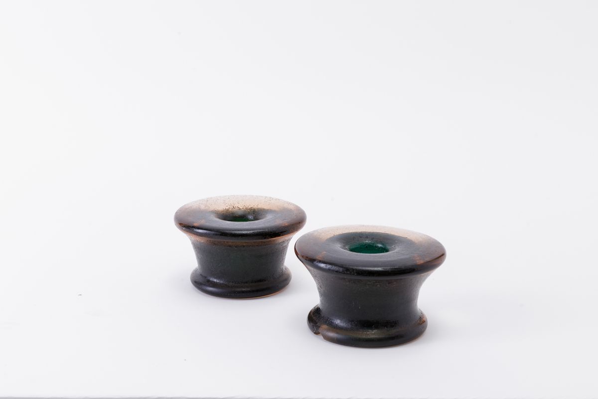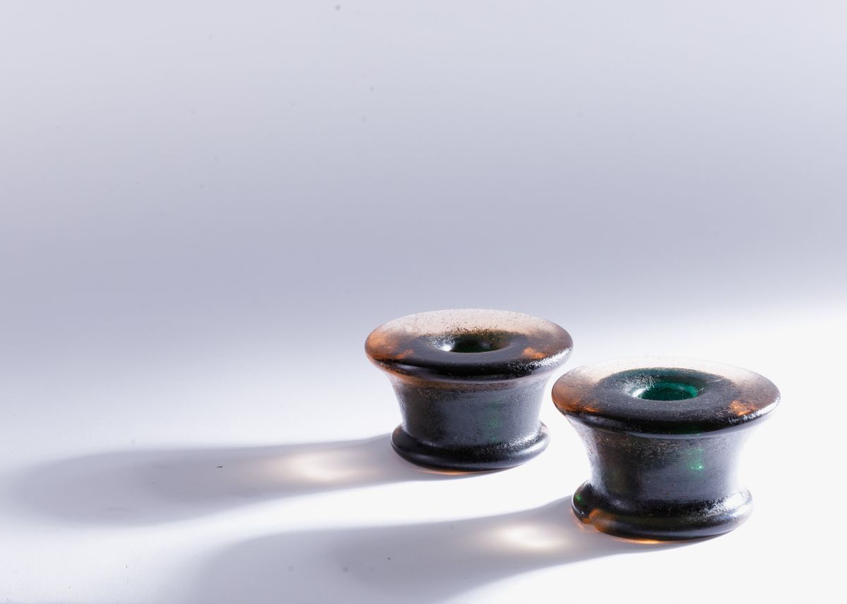 Carlo Scarpa (1906-1978). A pair of table lamps in two-tone heavy submerged glass with a fully acid-corroded surface. Diam 10.5cm, H 6cm. One of the two is acid-etched signed Venini Murano.