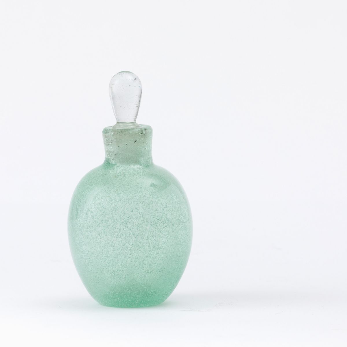 Carlo Scarpa (1906-1978). A green glass perfume bottle with a clear drop-shaped cap. H 13.5cm. Acid-etched signature GIVIEMME.