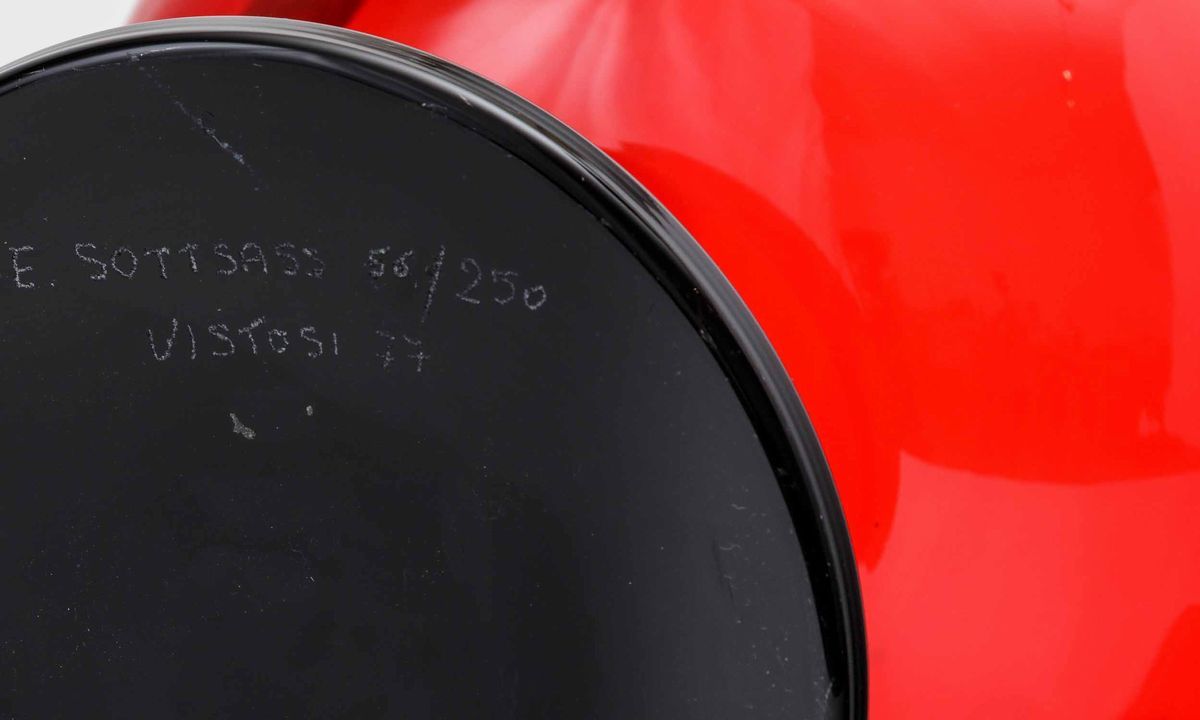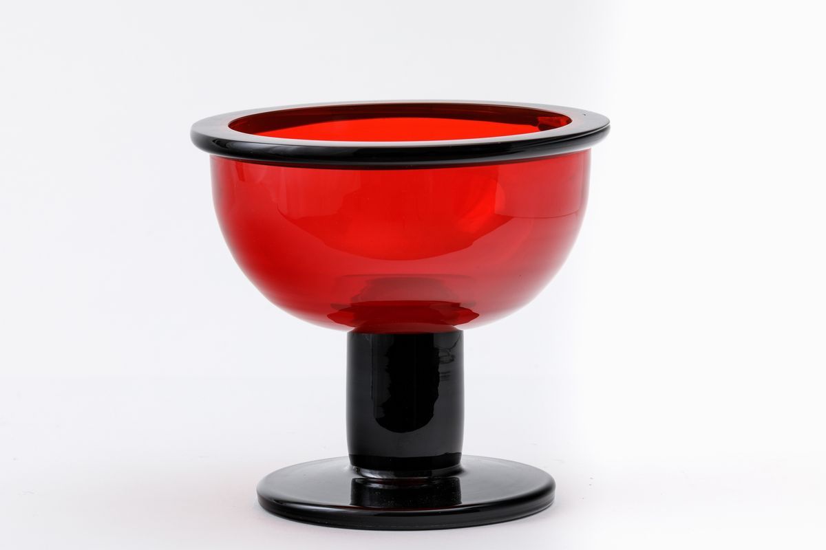 Ettore Sottsass (1917-2007). A red blown glass Aulica bowl on a tall black base with applied rim. H 20.5cm, diam 22.5cm. Engraved signature E. Sottsass 56/250 Vistosi 77
