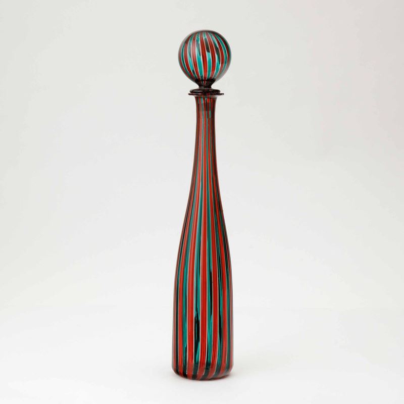 Fulvio Bianconi (1915-1996). A blown glass bottle with a spherical cap and a decor of red and green canes. H 49cm. Signed Venini Italia 85 and old label.