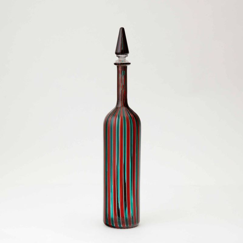 Fulvio Bianconi (1915-1996). A blown glass bottle with a spherical cap and a decor of red and green canes. H 46.5cm. Signed Venini 88 and old label.
