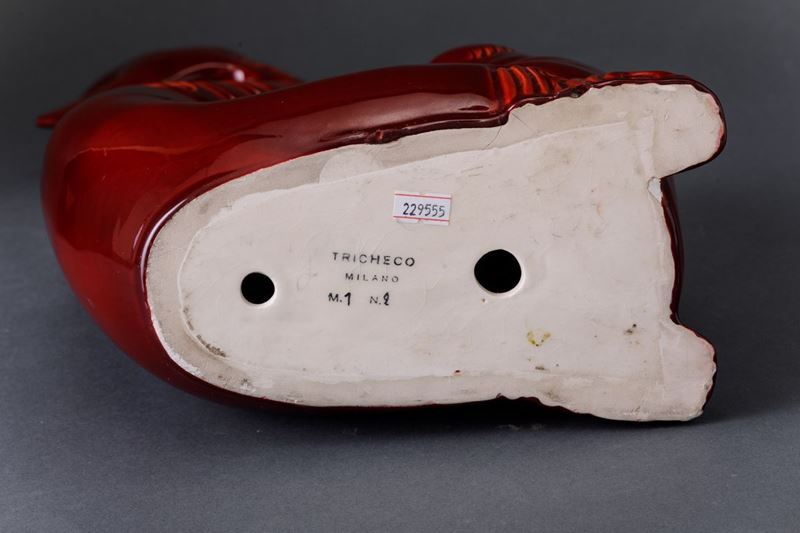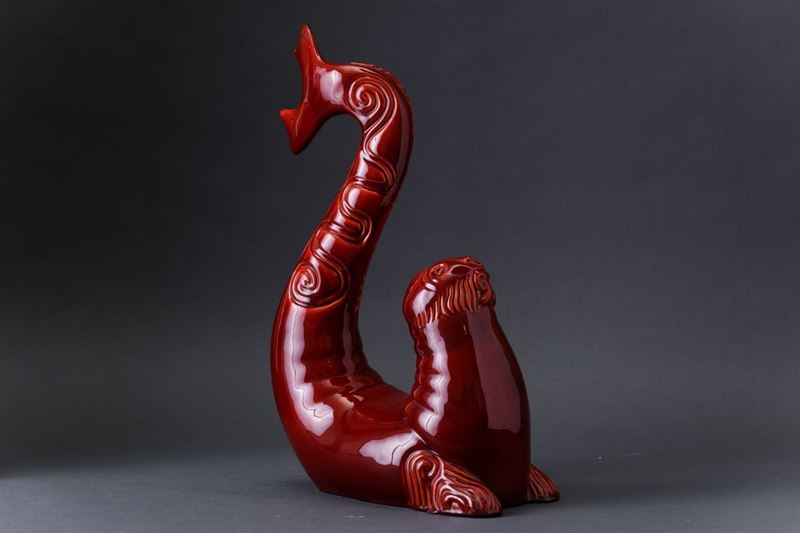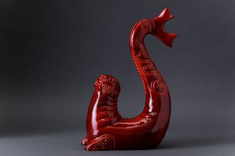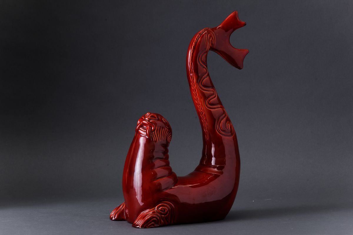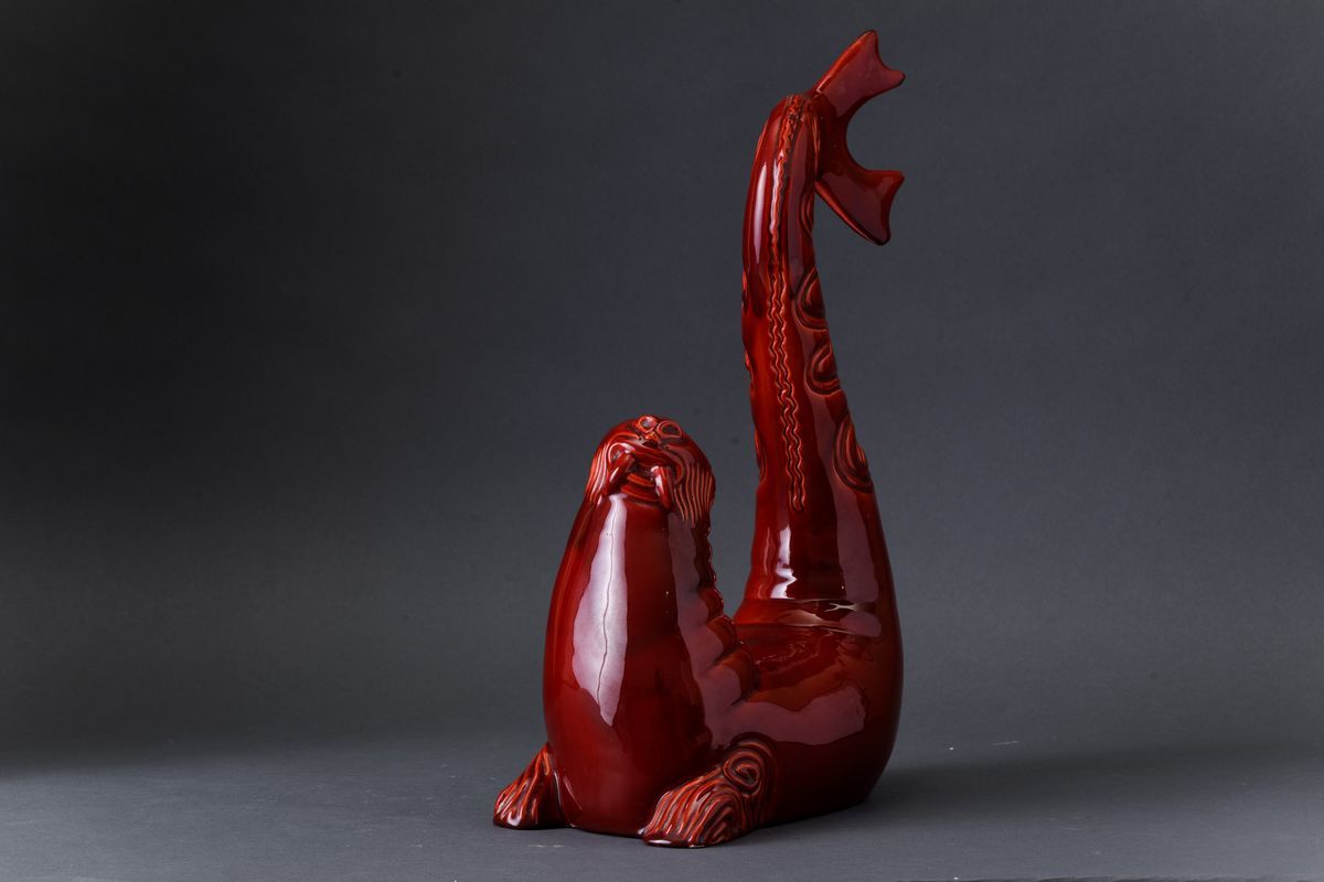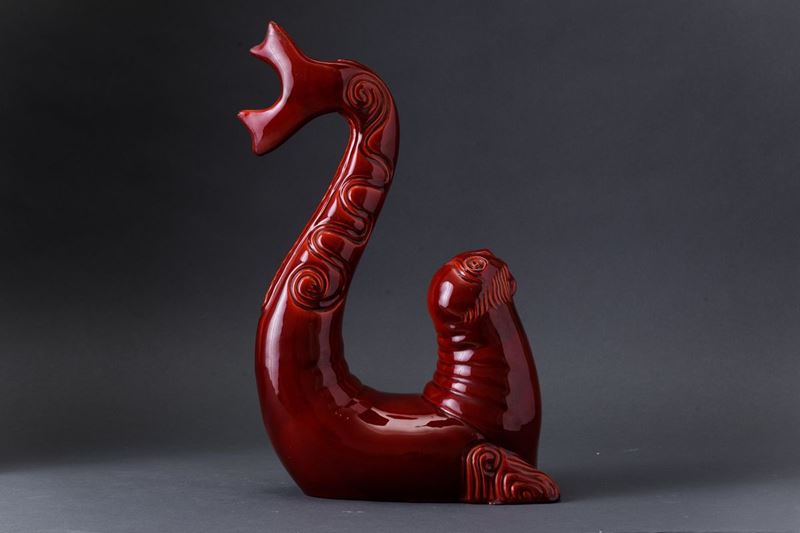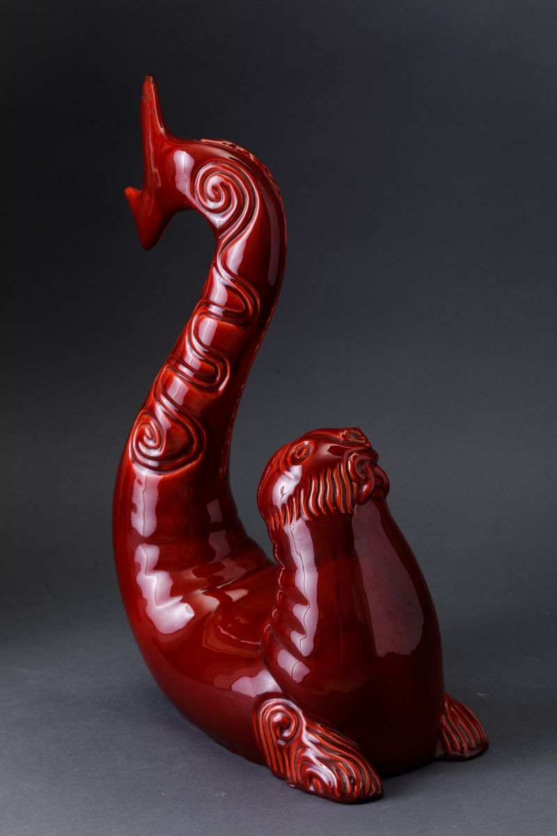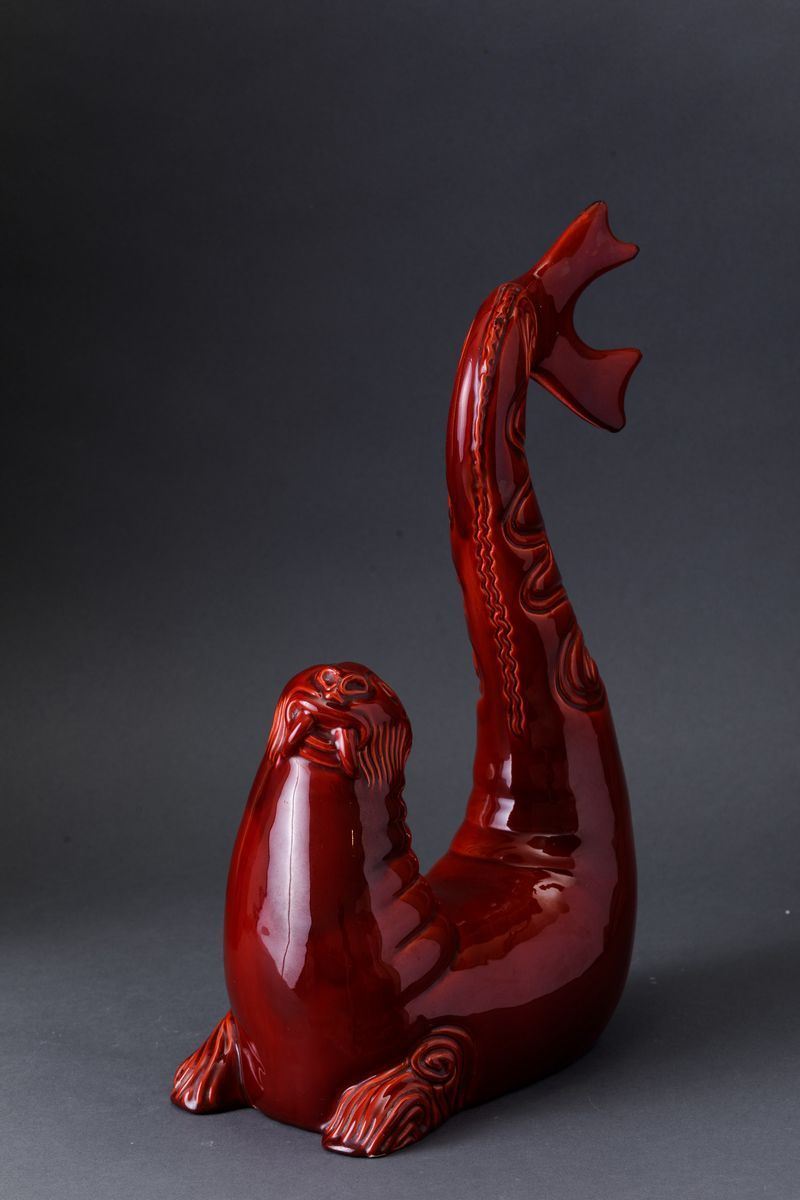 Fausto Melotti (1901-1986), Milan, 1938 ca. A rare slip cast earthenware figurine of a walrus with an oxblood enamel decor. H 41.5cm, 27x14cm. Marked Tricheco Milano M.1 N.2. Minor restorations on the tail.