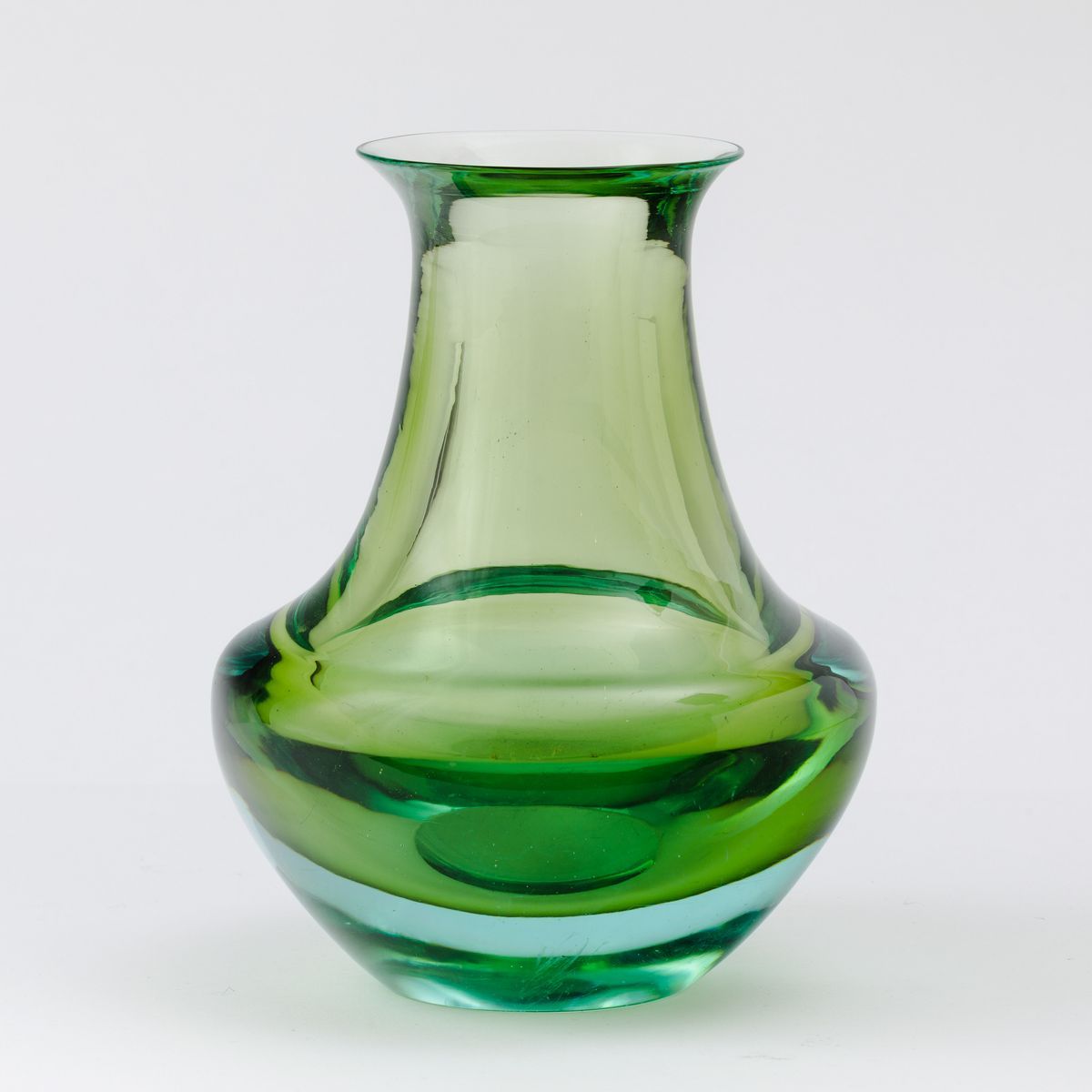 Flavio Poli (1900-1984). An amphor-shaped, wide-neck vase in green and light blue submerged glass. H 28.5cm, diam 21cm