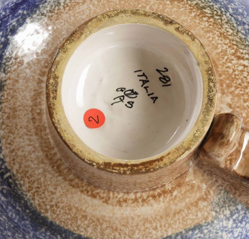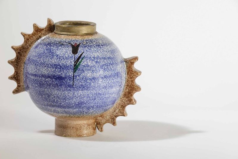 Giovanni Acquaviva (1900-1971). A futuristic spherical ceramic vase with asymmetrical handles and a decor of polychrome enamels and outlined flowers. Gilt brass ring around the mouth. H 22.5cm, diam 24cm. Manufacture's mark.