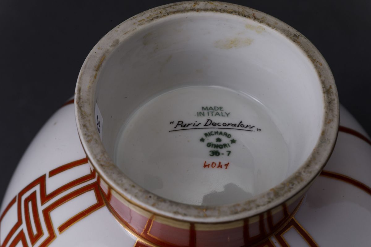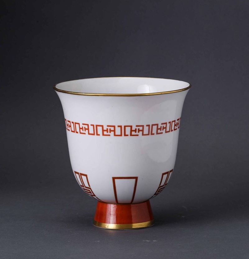 Gio Ponti (1891-1979). A porcelain bowl on a truncated cone-shaped base with a polychrome decor of friezes and third-firing gold filets. H 18cm, diam 18cm. Manufacture's mark and Paris Decorators on the base.