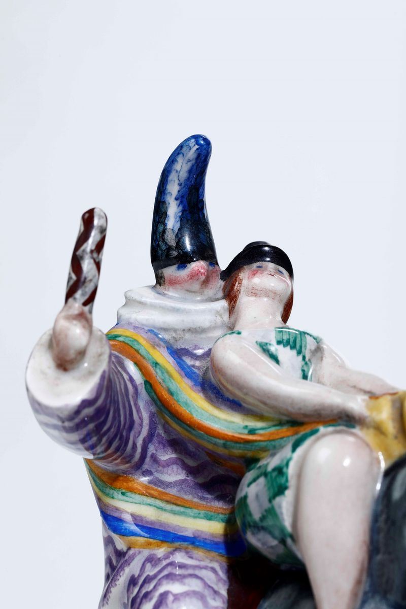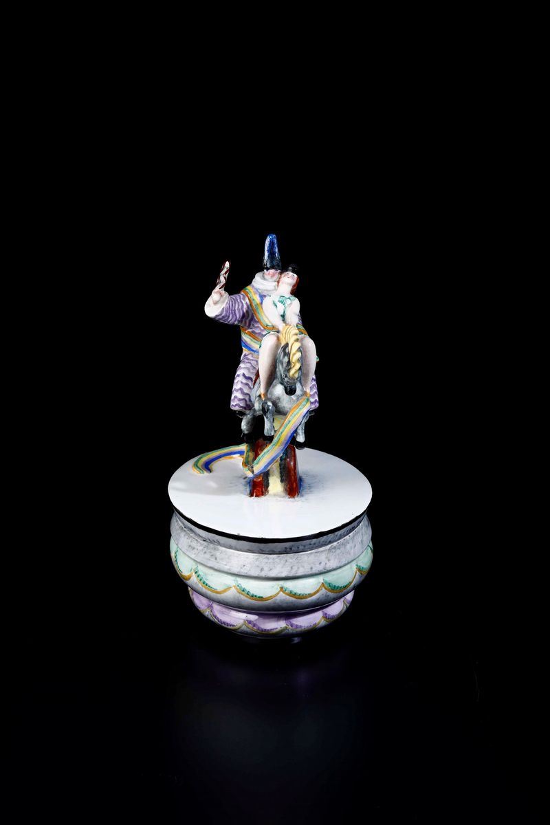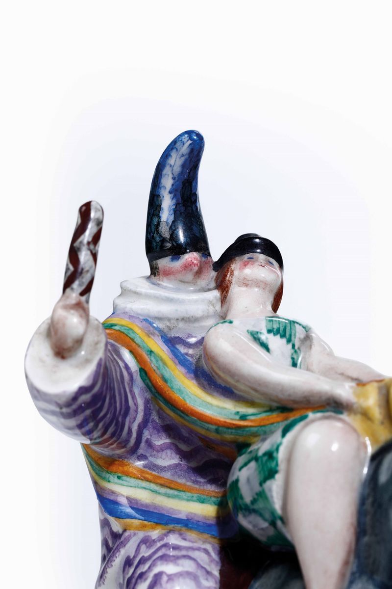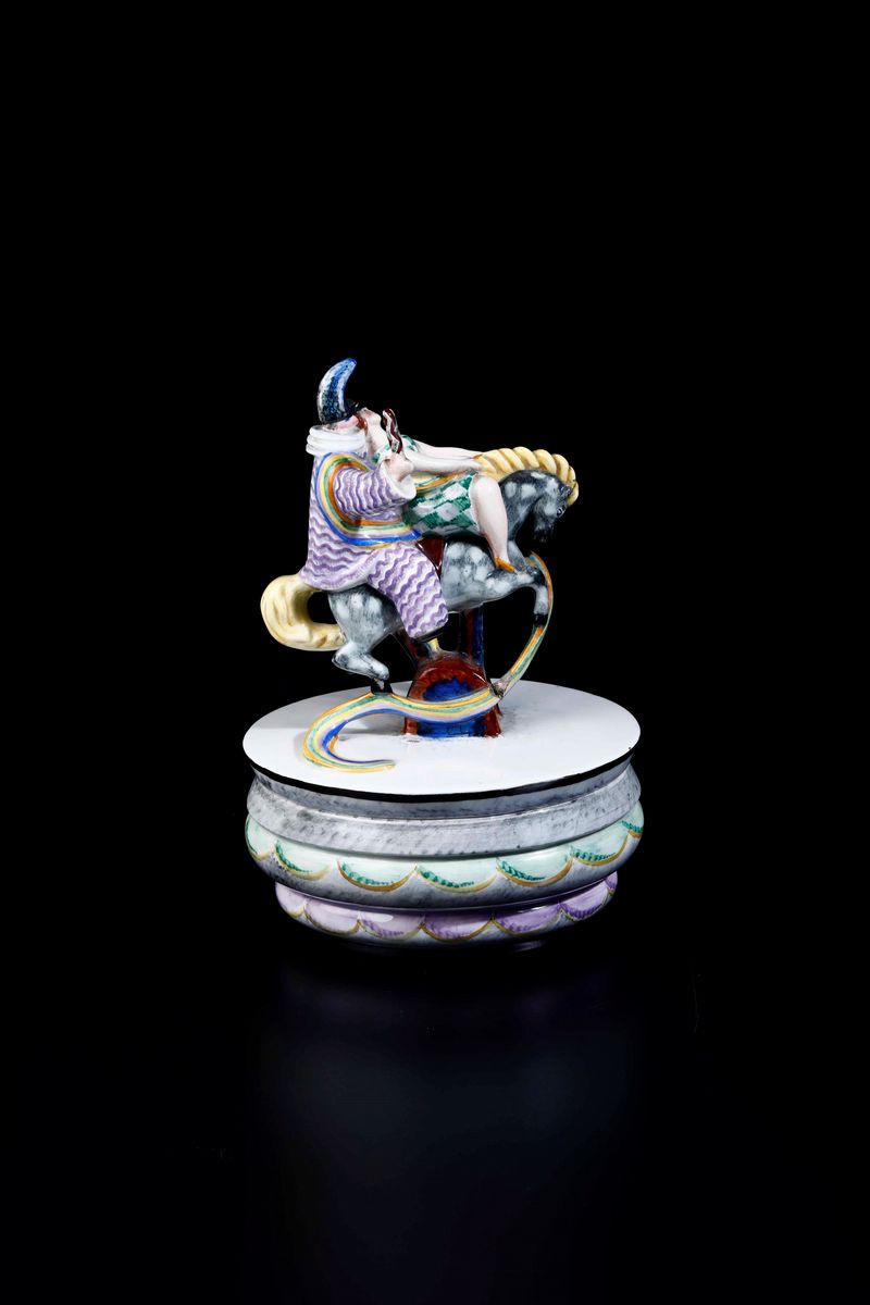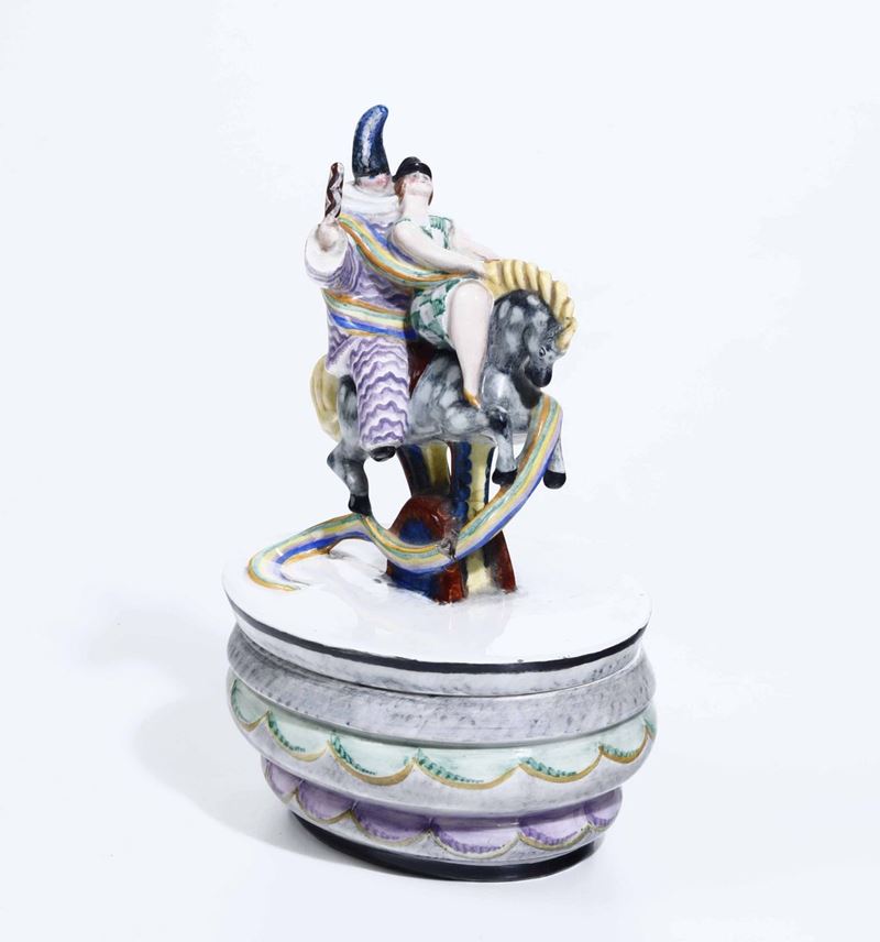 Carnival by Giovanni Grande (1887-1937). A slip cast earthenware box, with streamers and characters in costume riding a horse. Polychrome decor. 15x12cm, H 23cm. Manufacture's mark and date below the base. Chippings, missing parts and flaws on the multicoloured band.