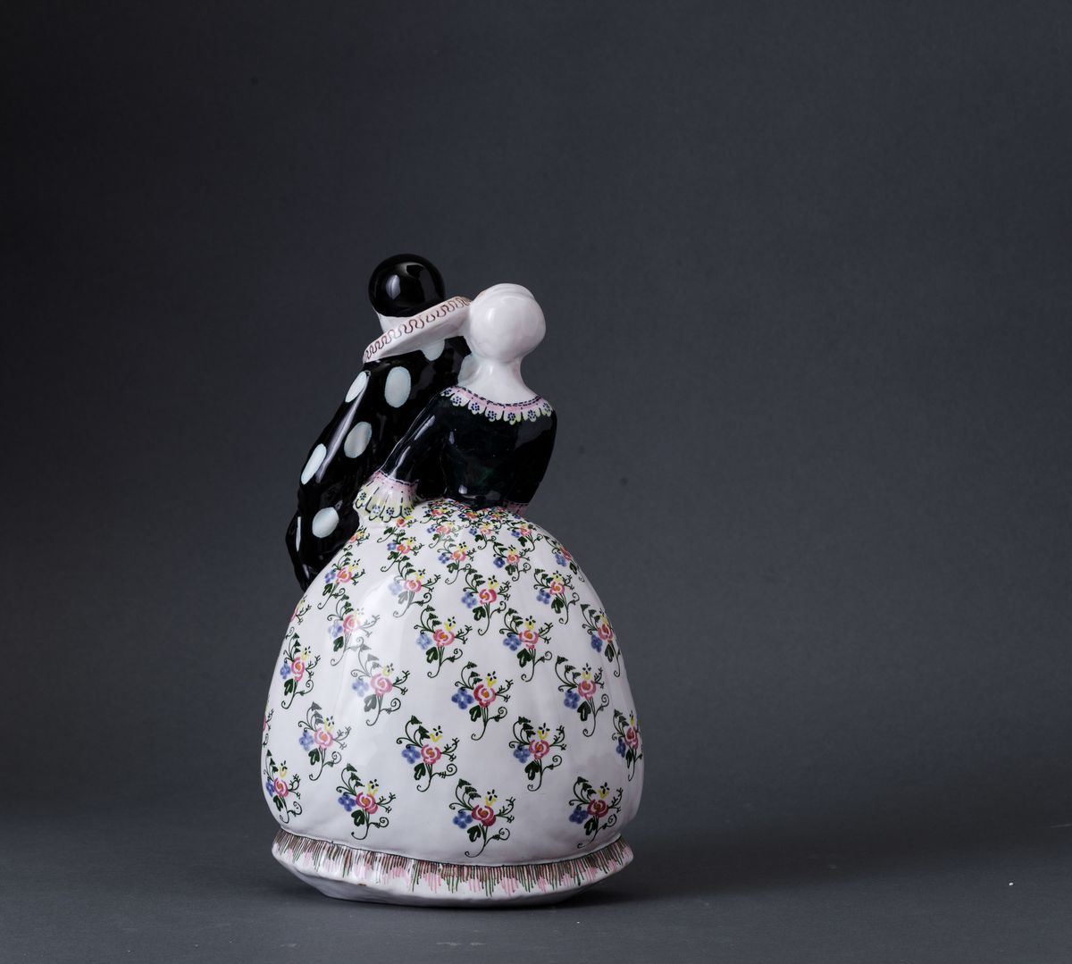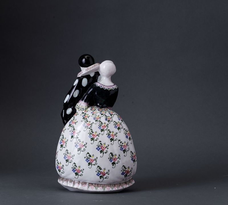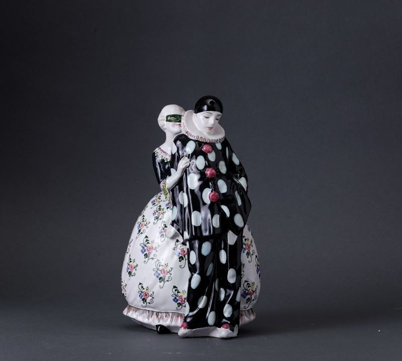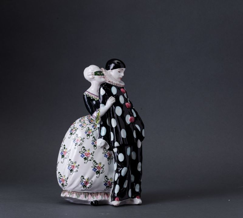 Francesco Nonni (1885-1976). A majolica-tiled slip cast earthenware figurine of Pierrot and a dame with a polychrome decor. H 26cm. Manufacture's mark Faenza Made in Italy, in blue.