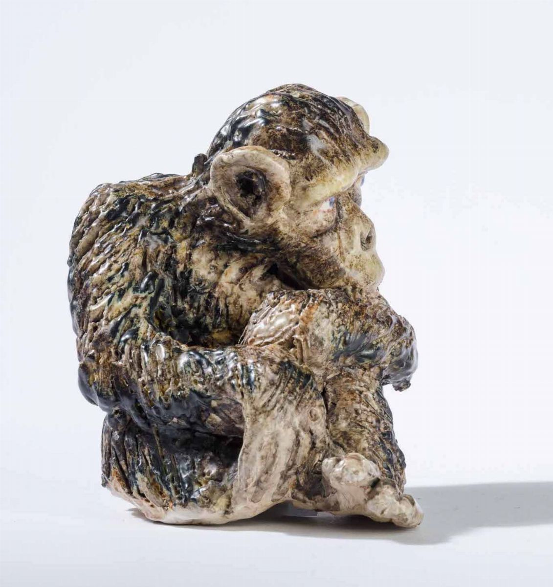 A ceramic sculpture of a chimpanzee with a polychrome enamelled decor. H 15cm. Manufacture's mark.