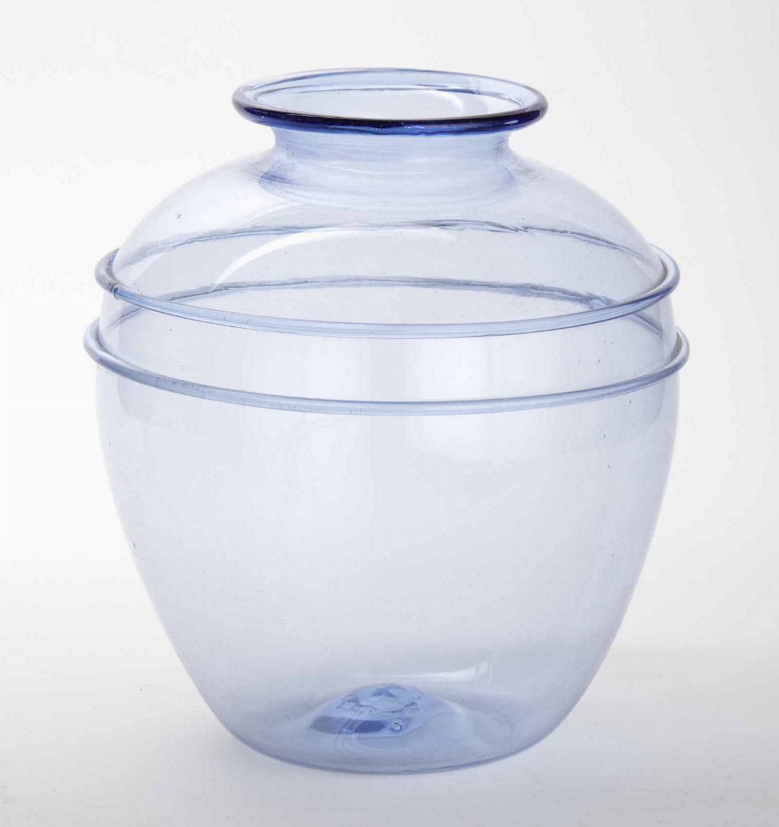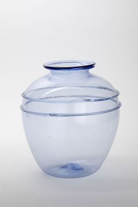 A large blown glass vase with applied rings. H 30cm, diam 28cm. Broken parts and restorations.