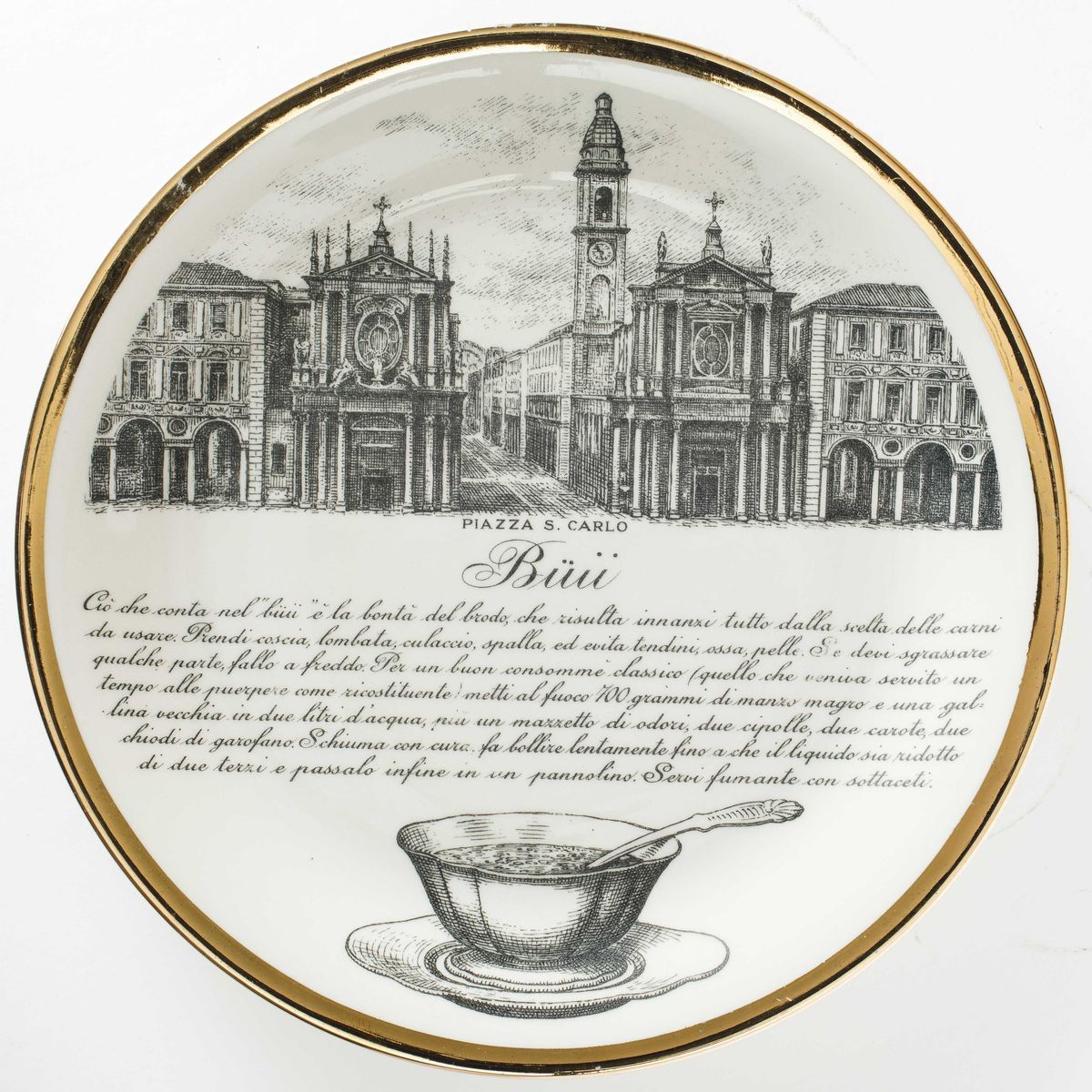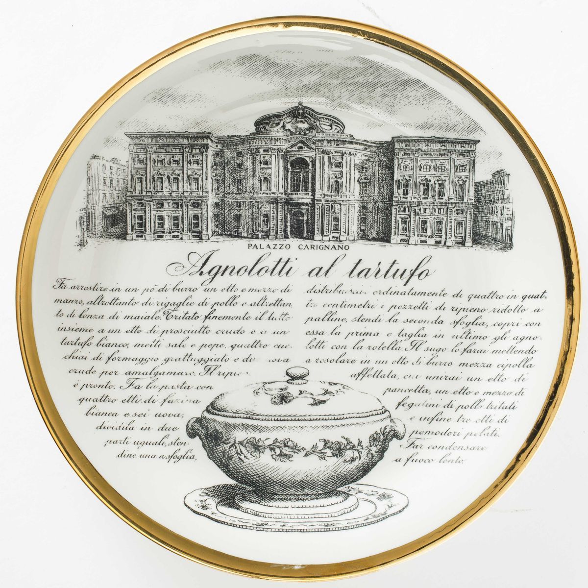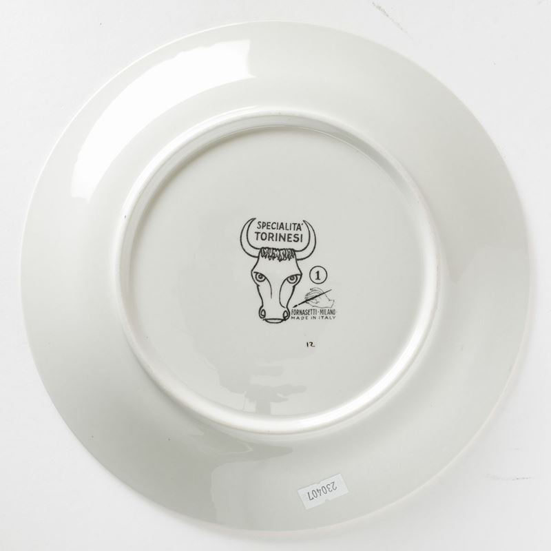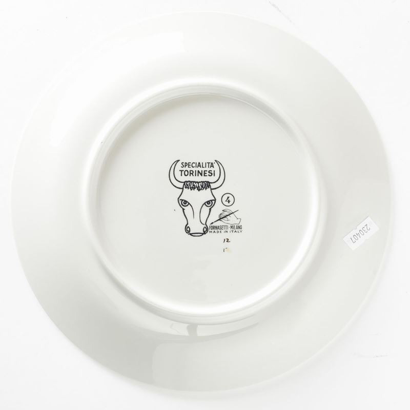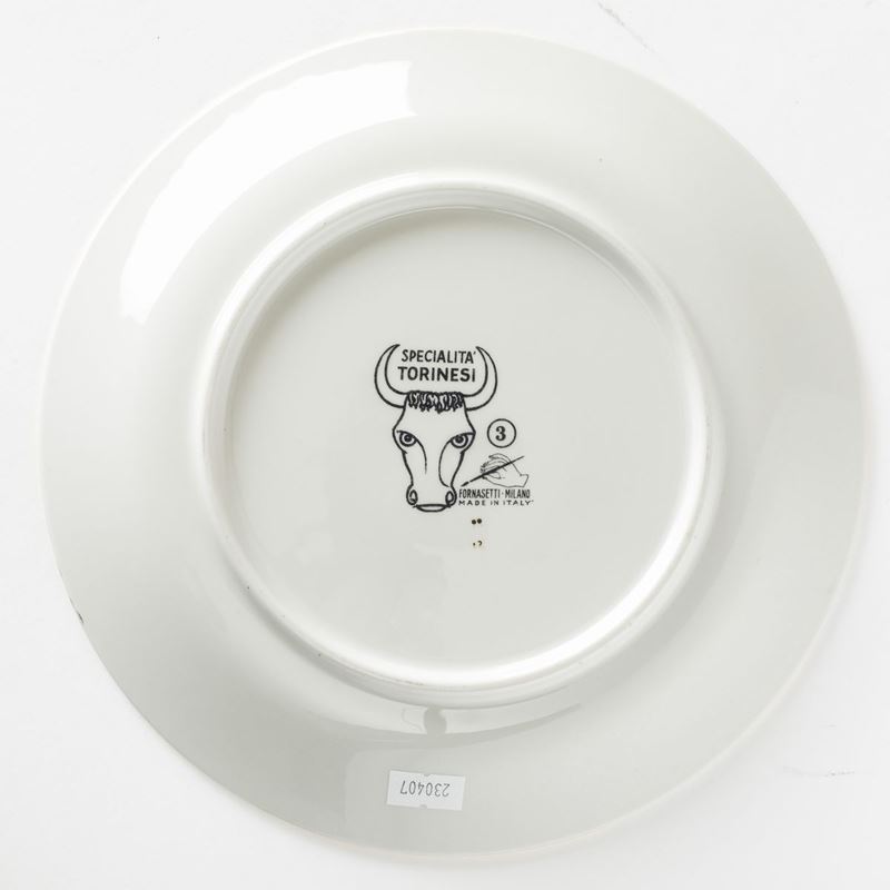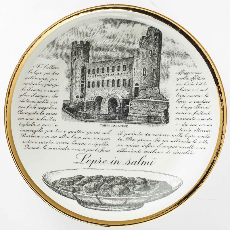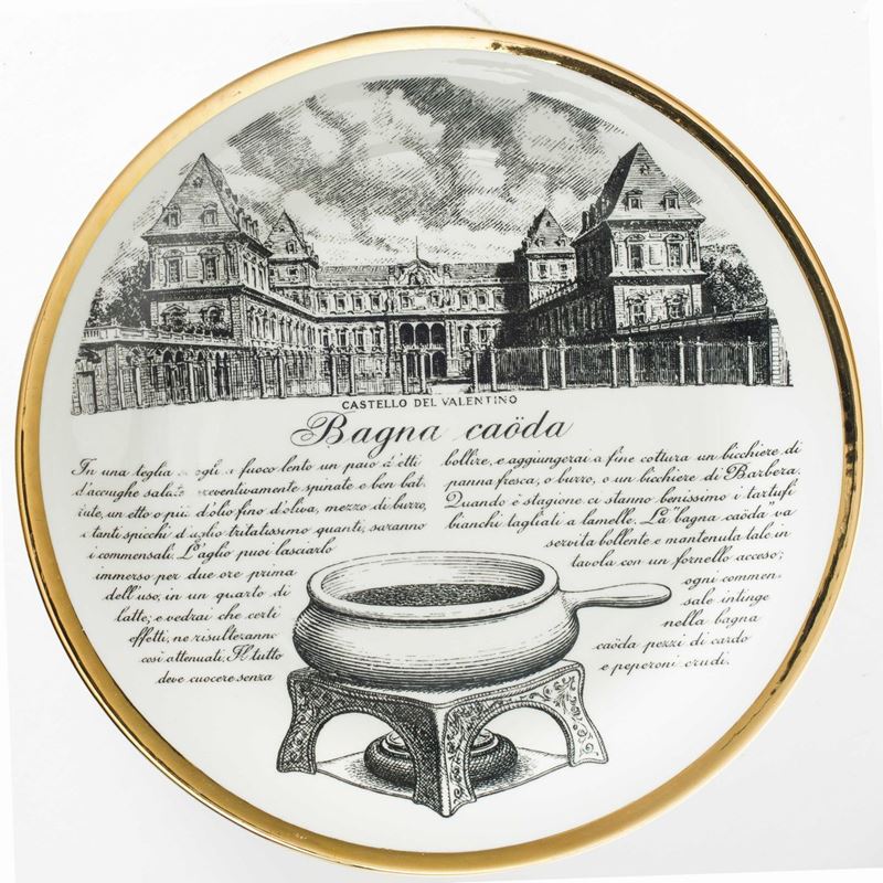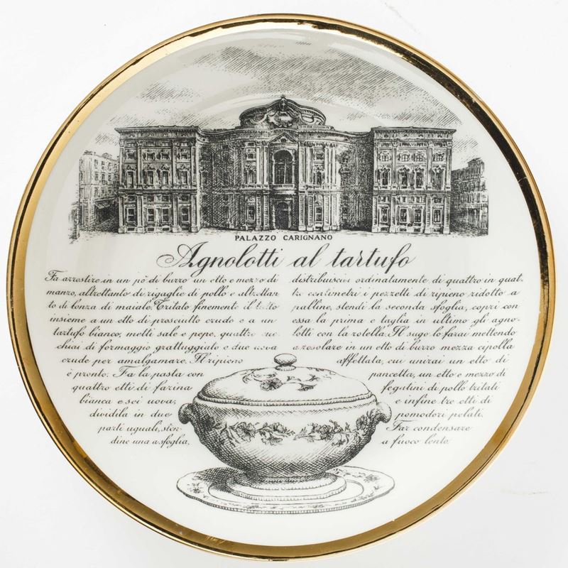 Piero Fornasetti (1913-1988). A lot of six plates featuring culinary recipes from the Specialità Torinesi series. Porcelain with a silk-screen printed decor and gold rims. Diam 24.5cm. Manufacture's mark.