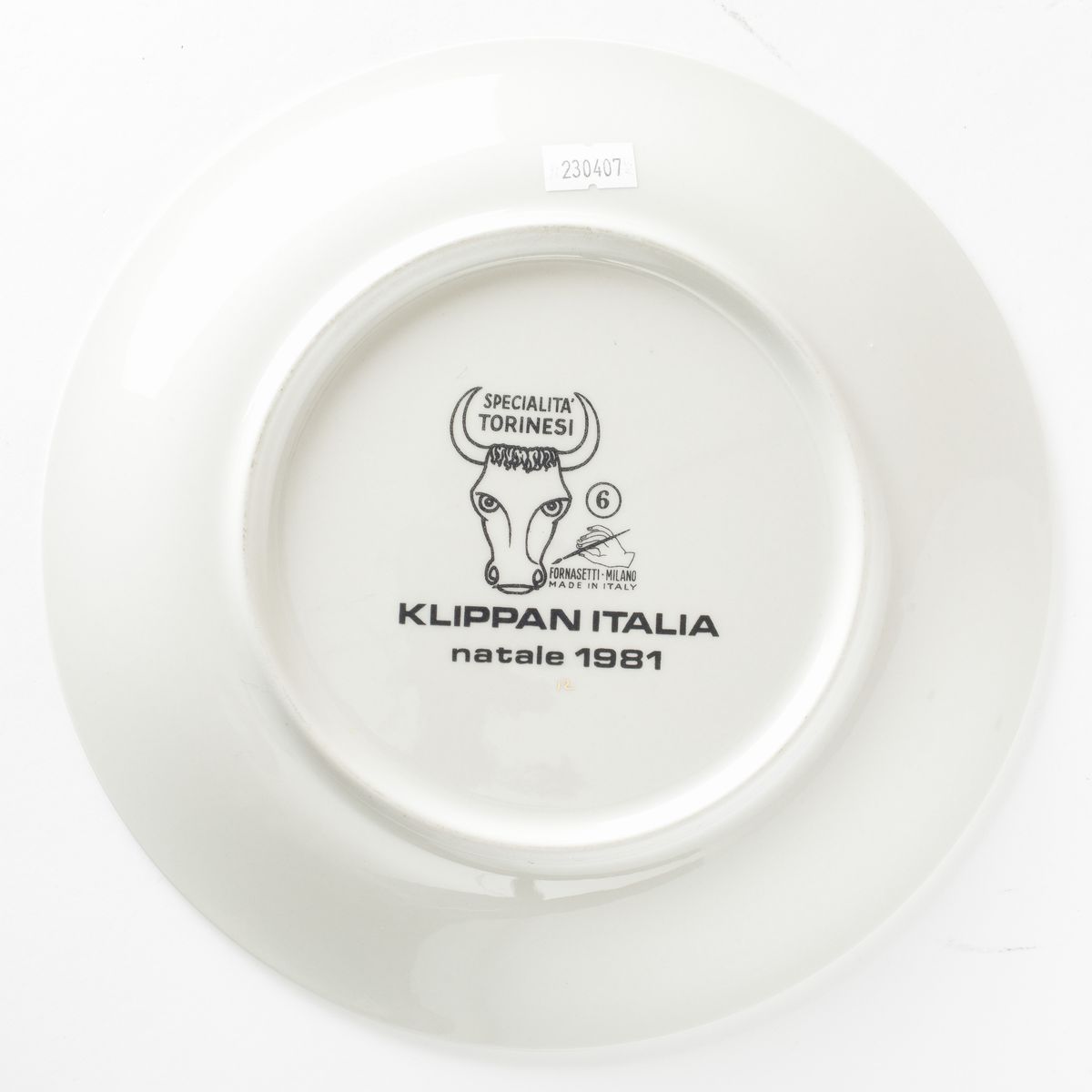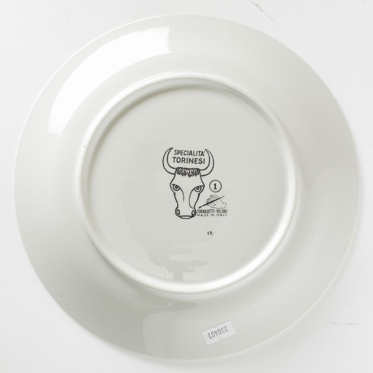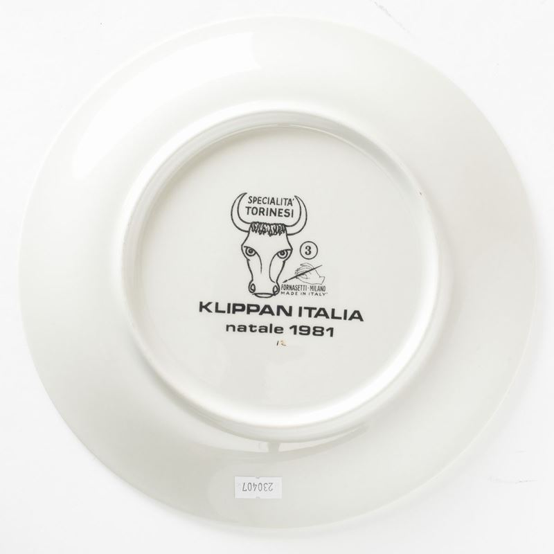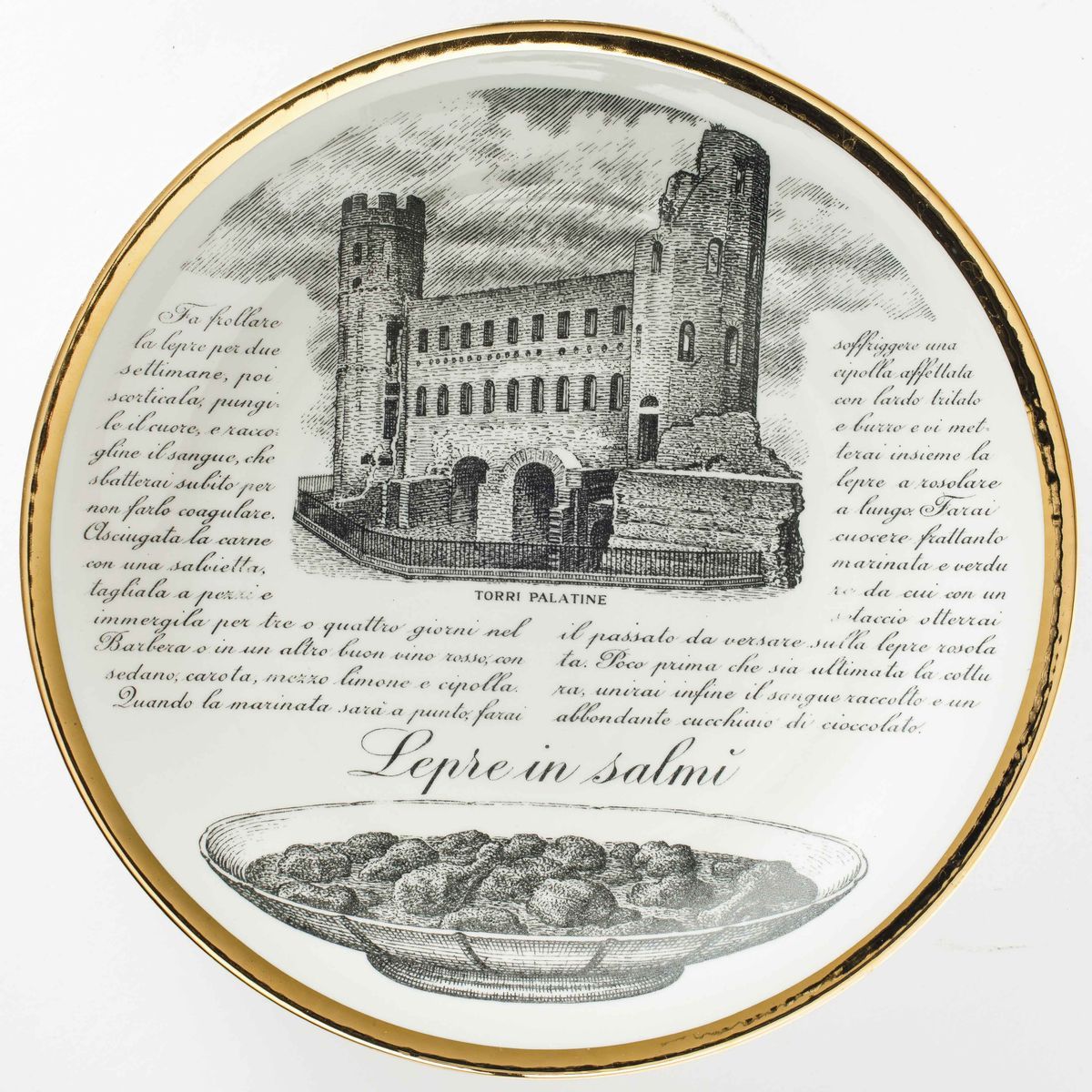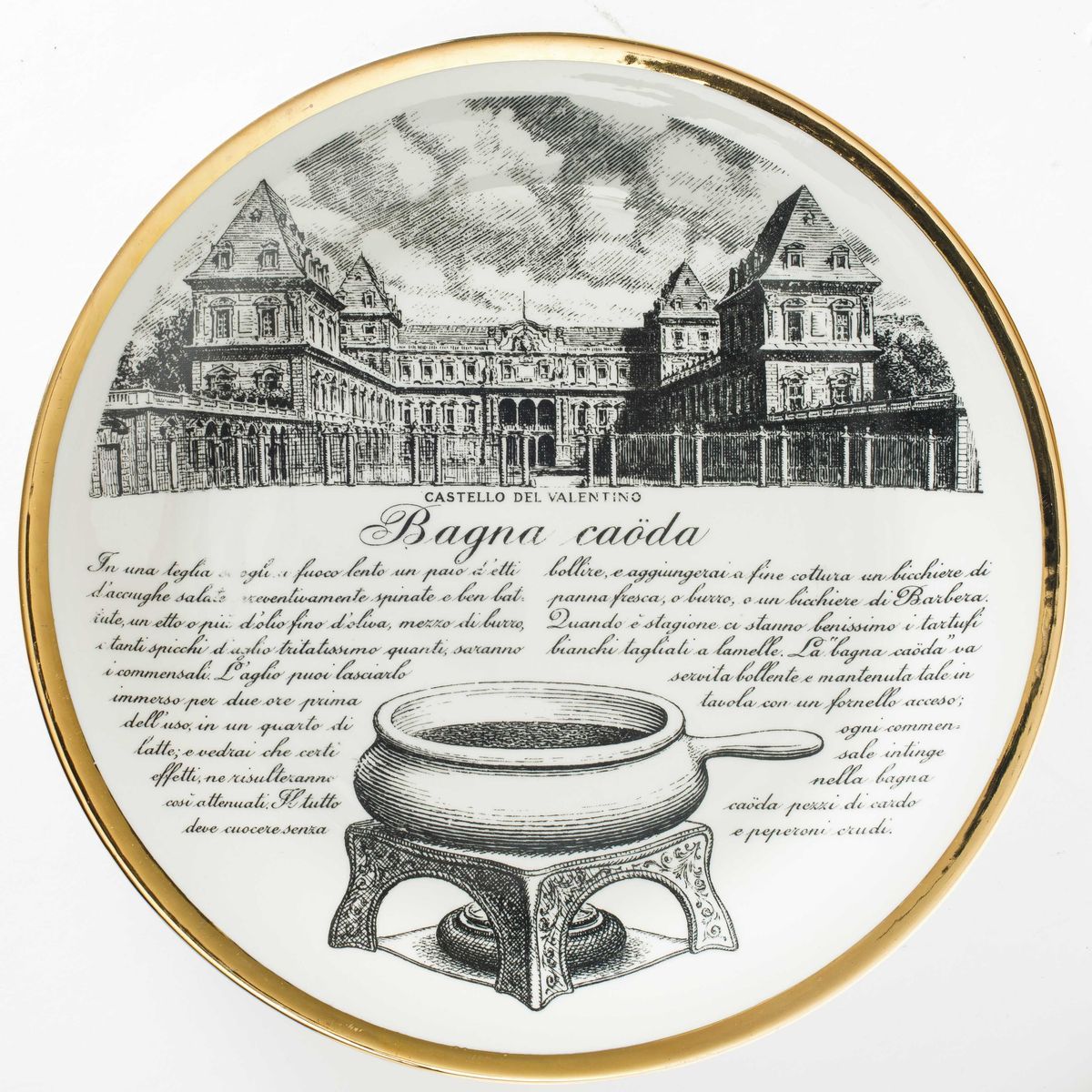 Piero Fornasetti (1913-1988). A lot of six plates featuring culinary recipes from the Specialità Torinesi series. Porcelain with a silk-screen printed decor and gold rims. Diam 24.5cm. Manufacture's mark.