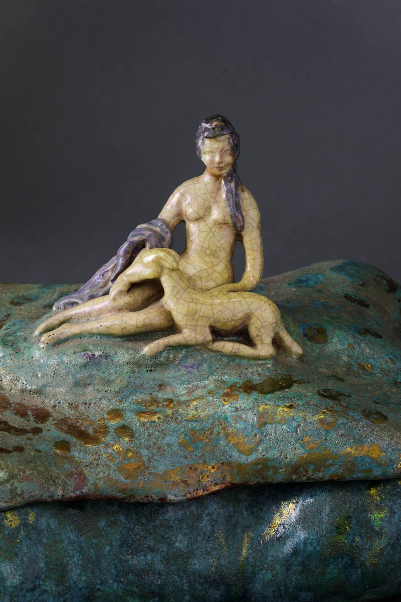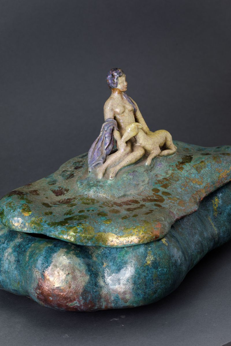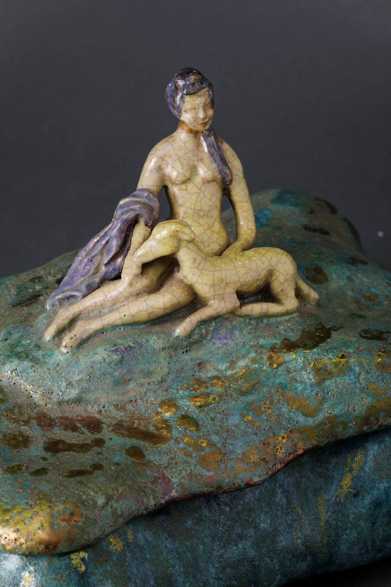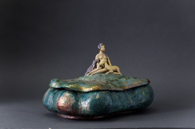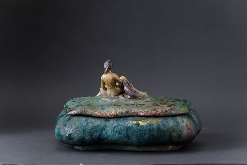 Riccardo Gatti (1886-1972). A large majolica-tiled terracotta box in a polylobate shape with a figure of a woman with a lamb, a polychrome enamel decor and lustres. H 21cm, 36x26cm. Signed Gatti Faenza.