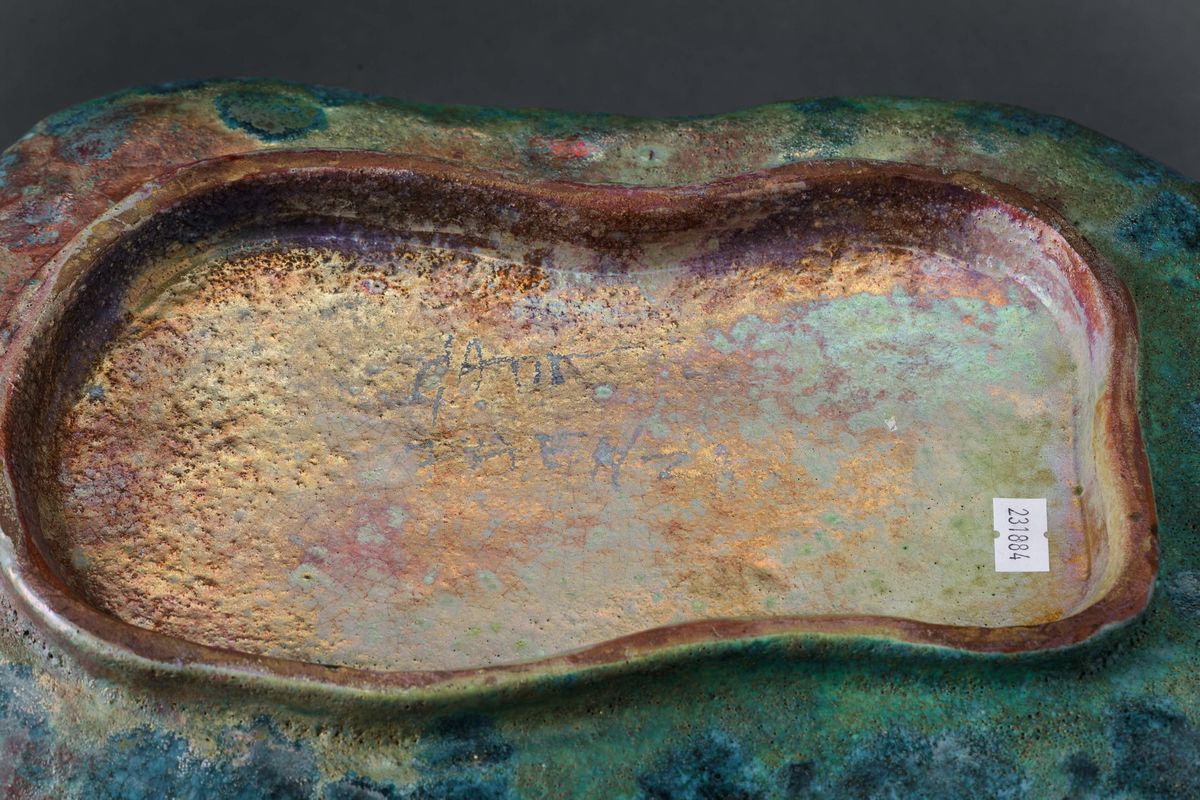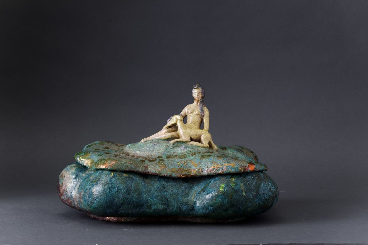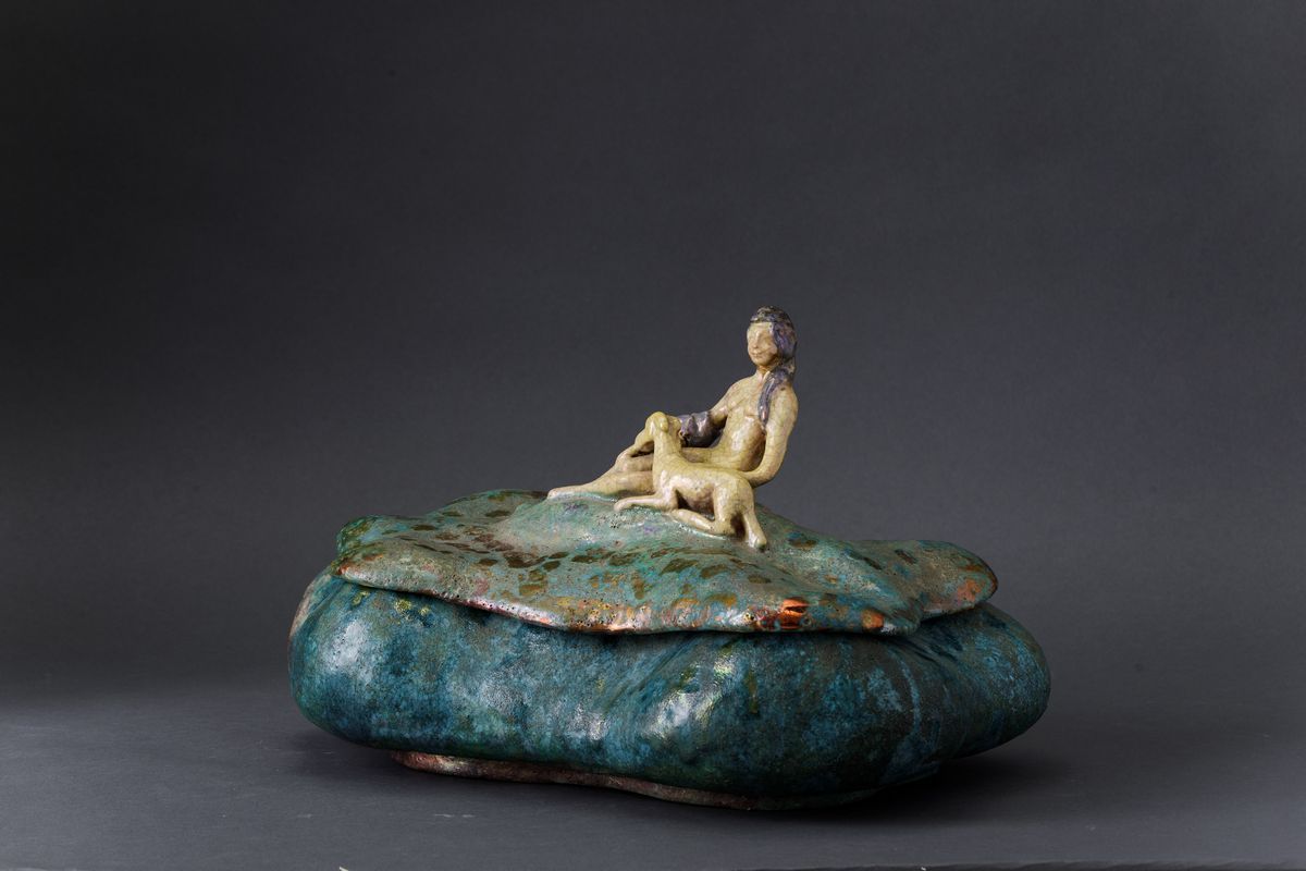 Riccardo Gatti (1886-1972). A large majolica-tiled terracotta box in a polylobate shape with a figure of a woman with a lamb, a polychrome enamel decor and lustres. H 21cm, 36x26cm. Signed Gatti Faenza.