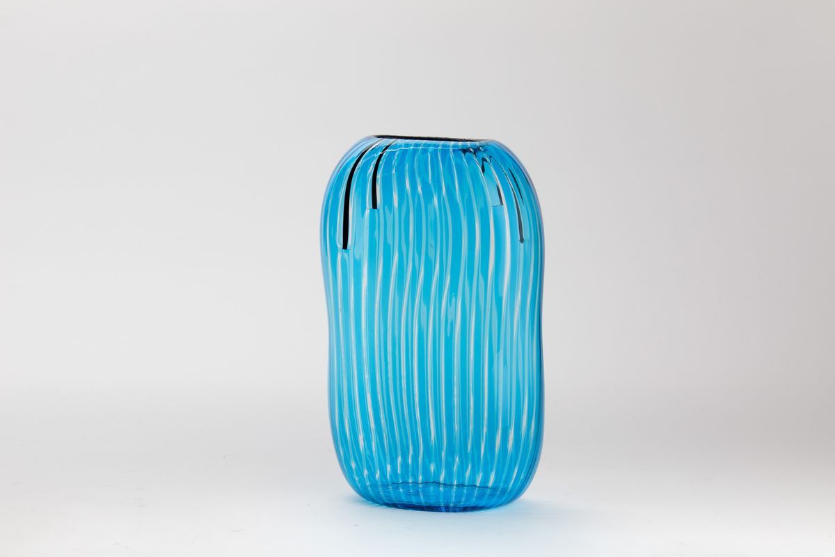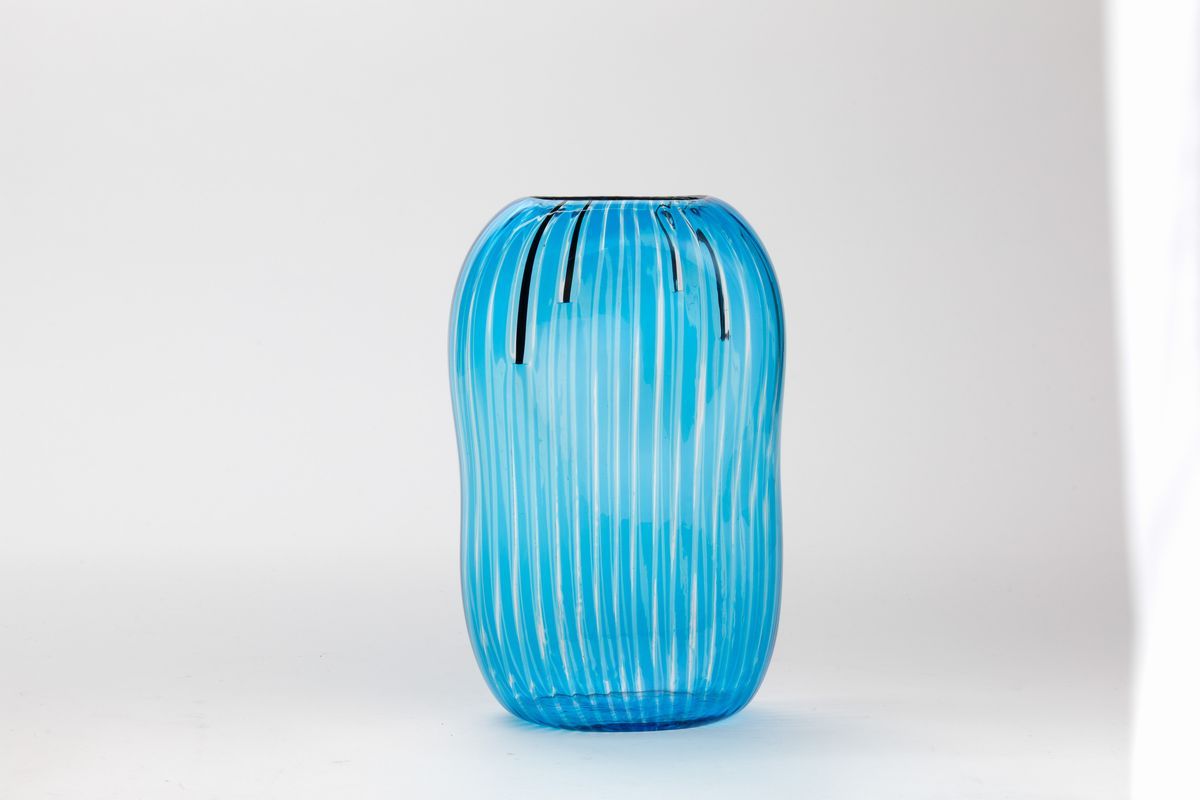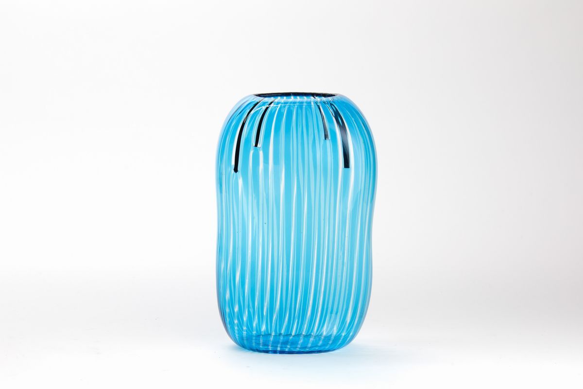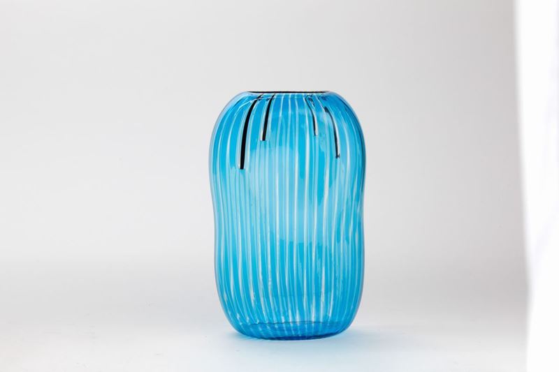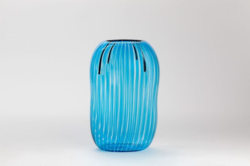 Sergio Asti (1926). An oval-section blown glass vase from the Clio series with a decor of polychrome turquoise and purple canes. H 27cm, 16x9cm. Engraved signature Salviati.