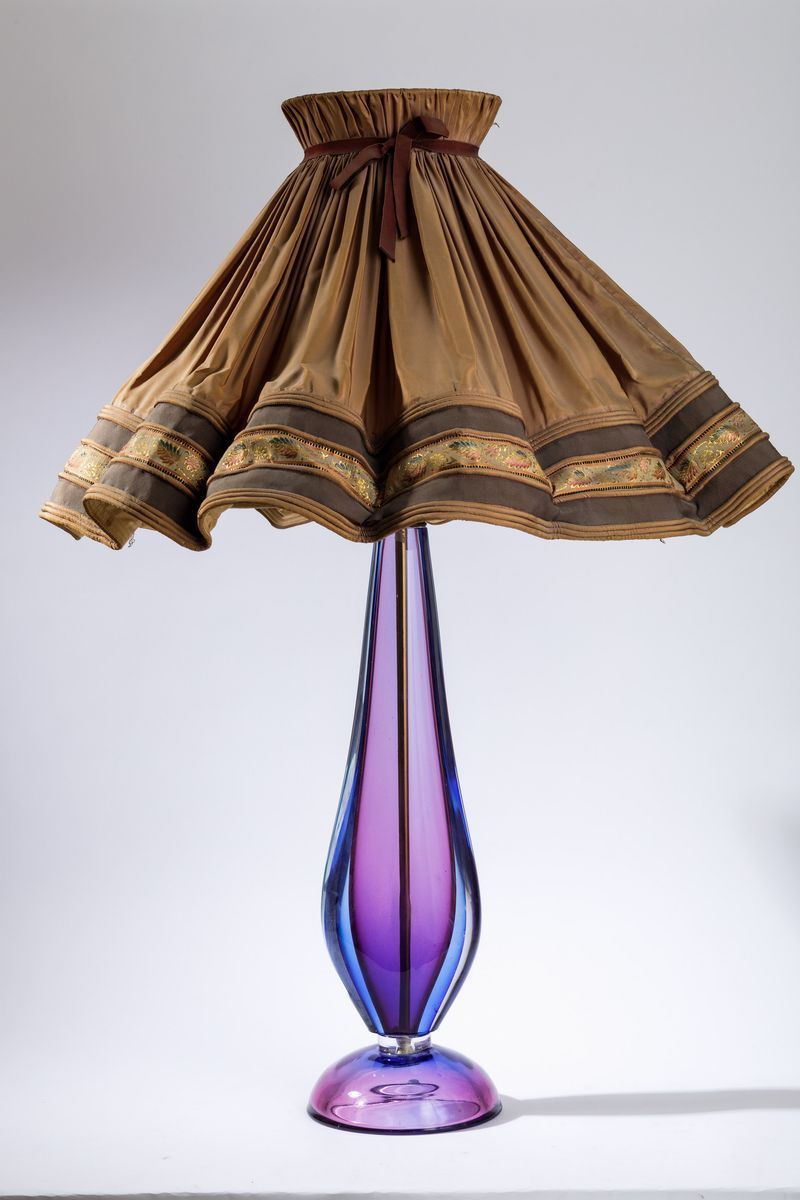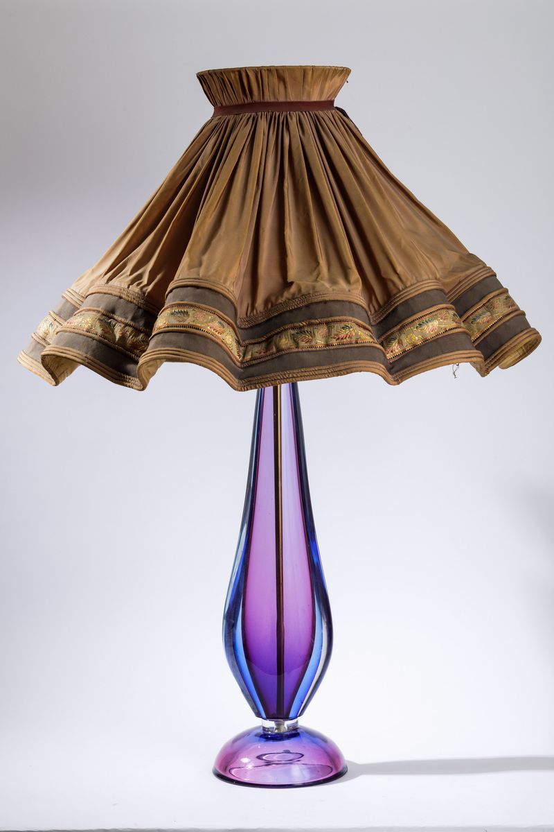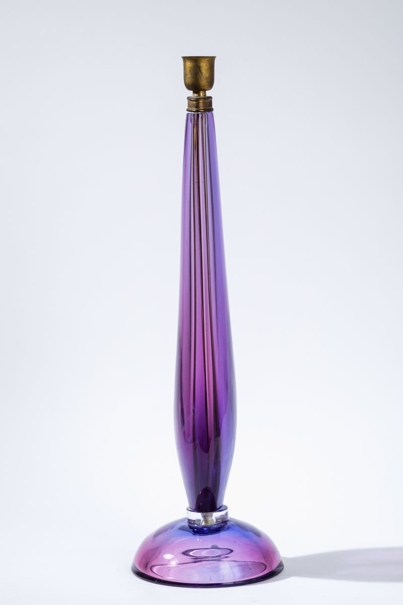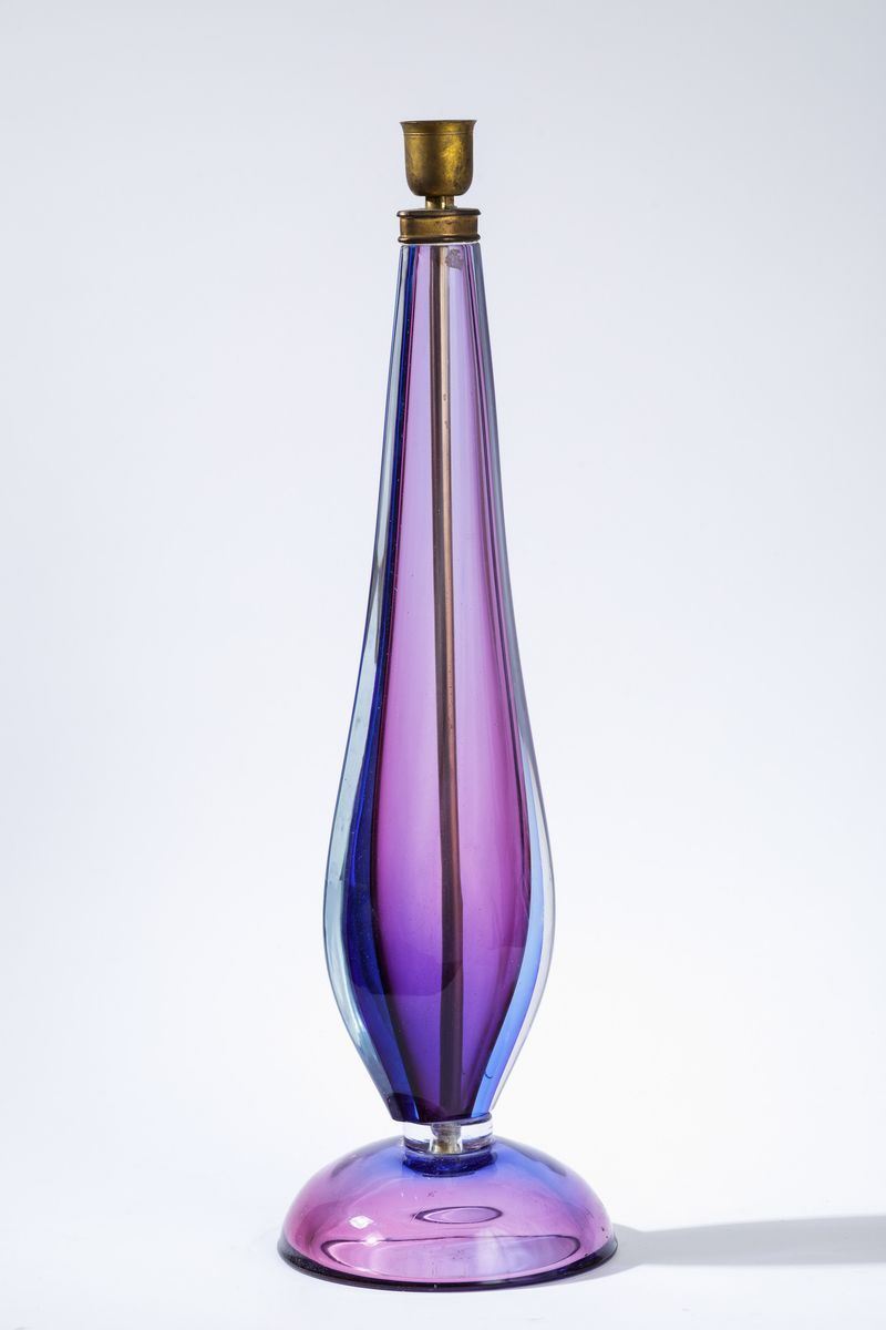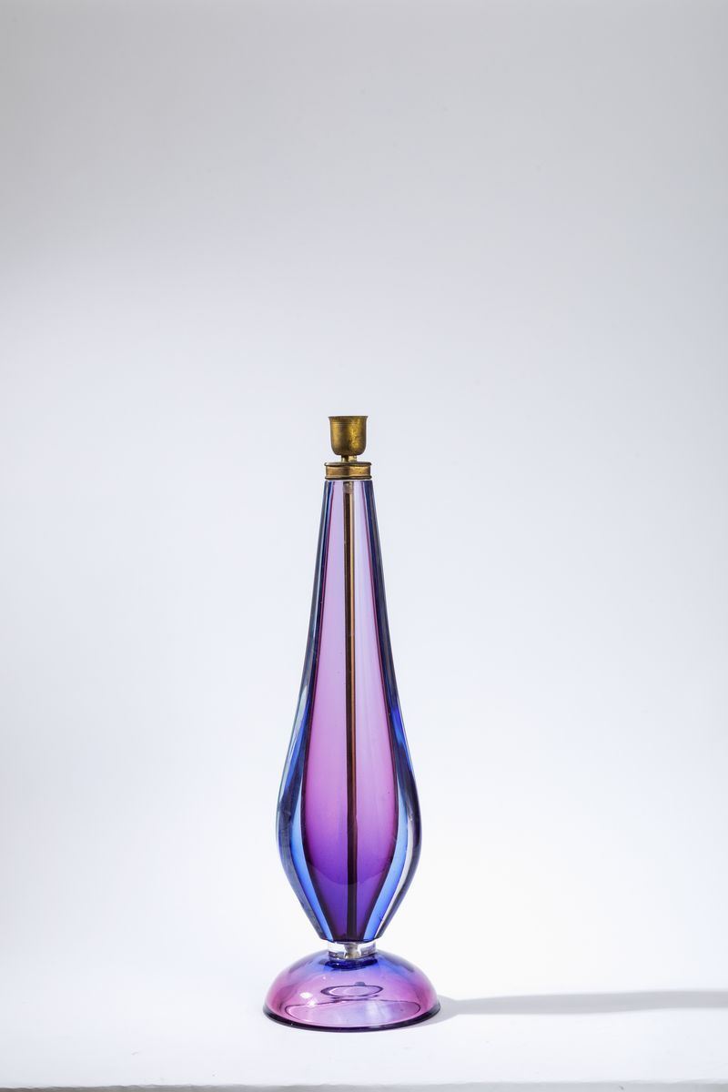 Flavio Poli (1900-1984). A teardrop-shaped table lamp base in two-tone cyclamen and light blue submerged glass on a half-sphere base. Gilt brass mounting and original lampshade. H 60cm