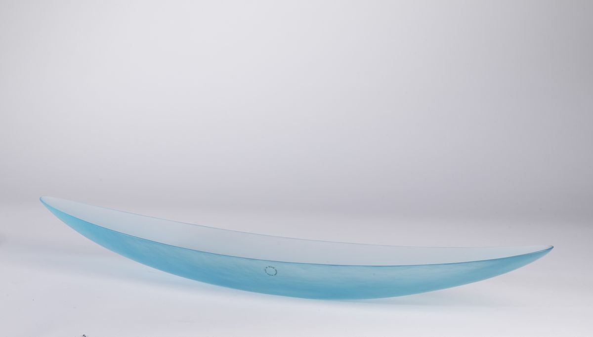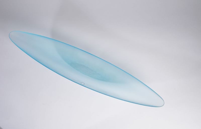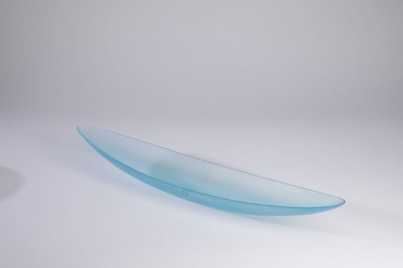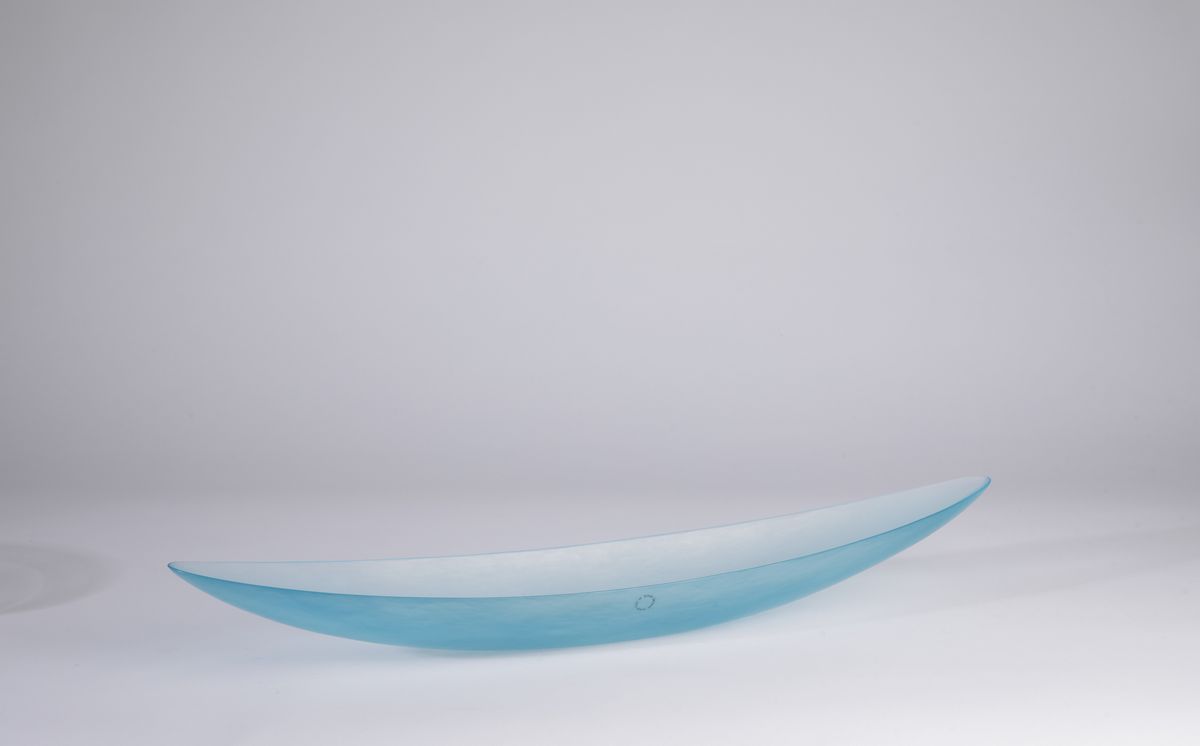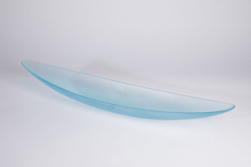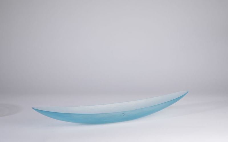 Tobia Scarpa (1935). A large aquamarine blown glass canoe with a fully ground surface. 60x12cm, H 8cm. Engraved signature Venini 1989/06 and old label.