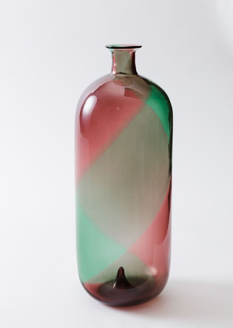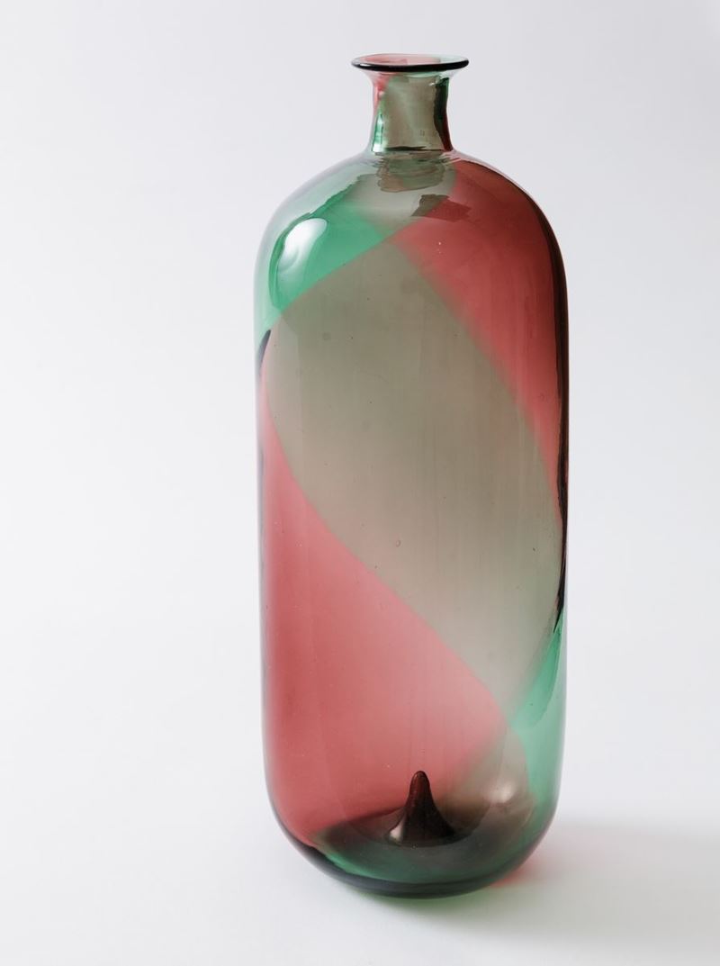 Tapio Wirkkala (1915-1985). A bottle-shaped blown glass vase from the Coreani series with a decor of green and purple spirals. H 31cm. Signed Venini Murano.