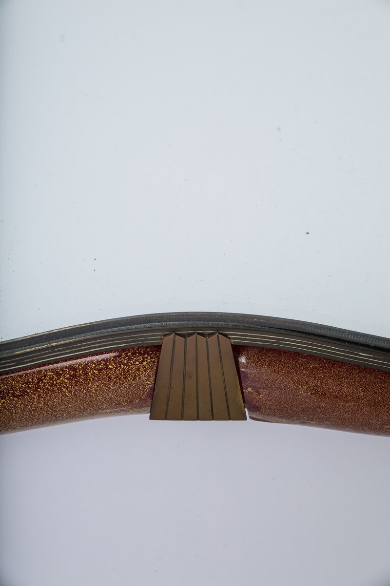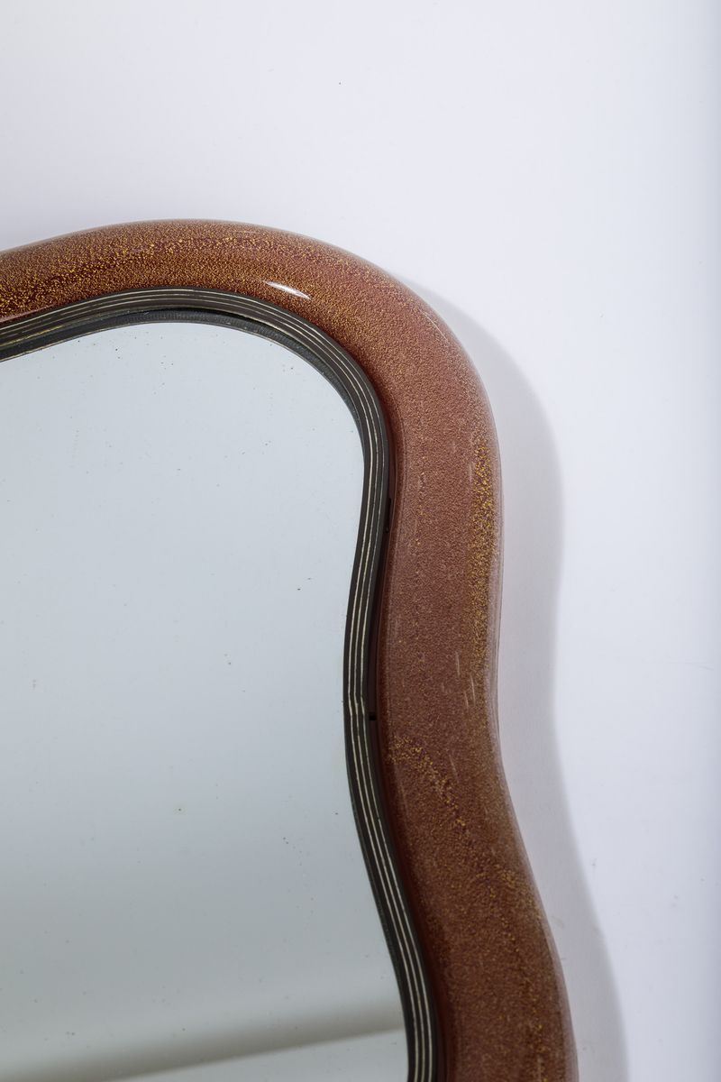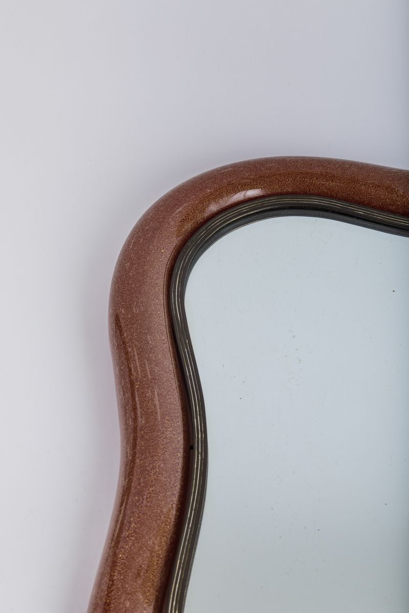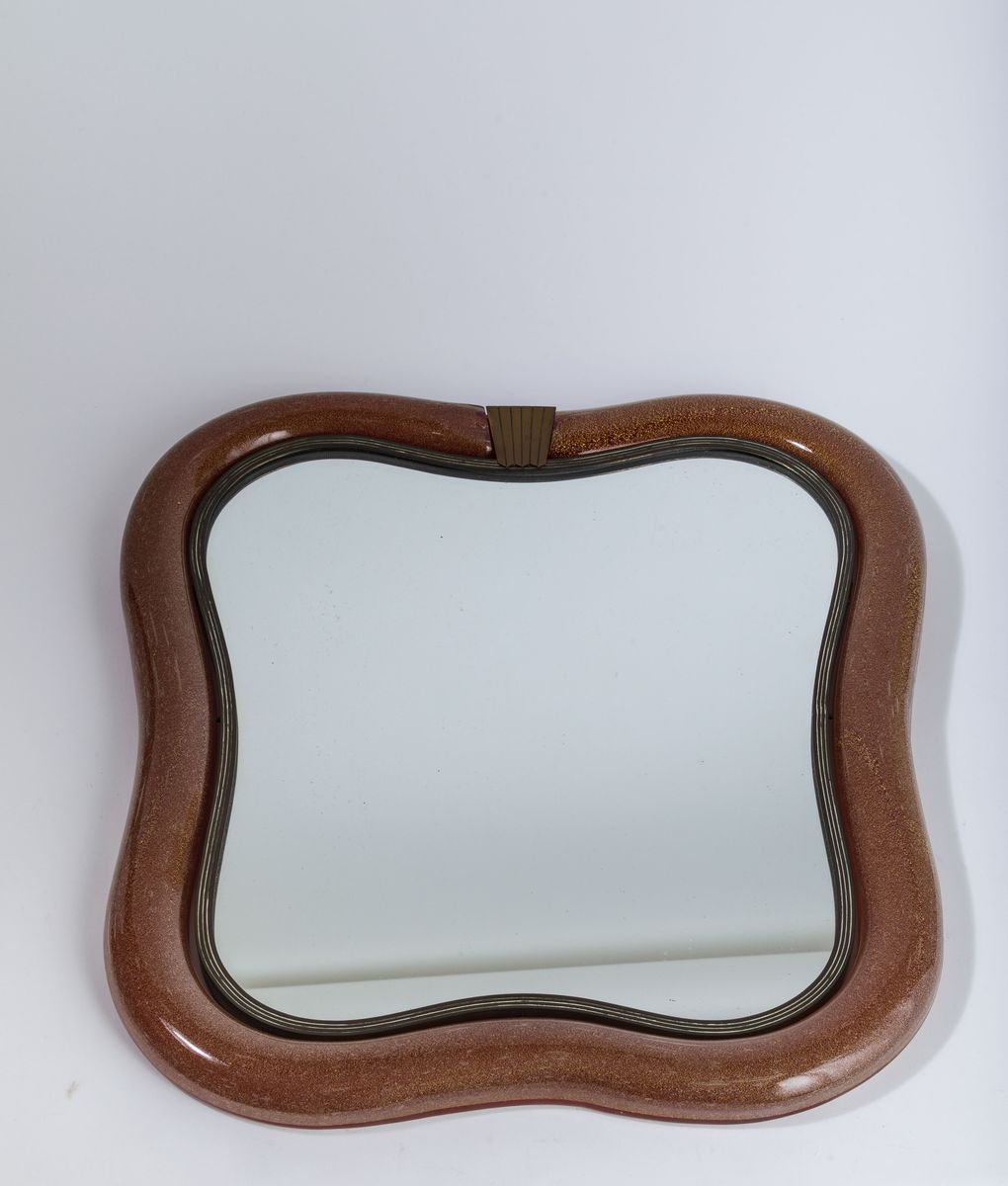 A wall or table mirror with a red submerged glass frame with bubbles and gold leaf. Brass mounting. 51x55cm. Engraved signature.