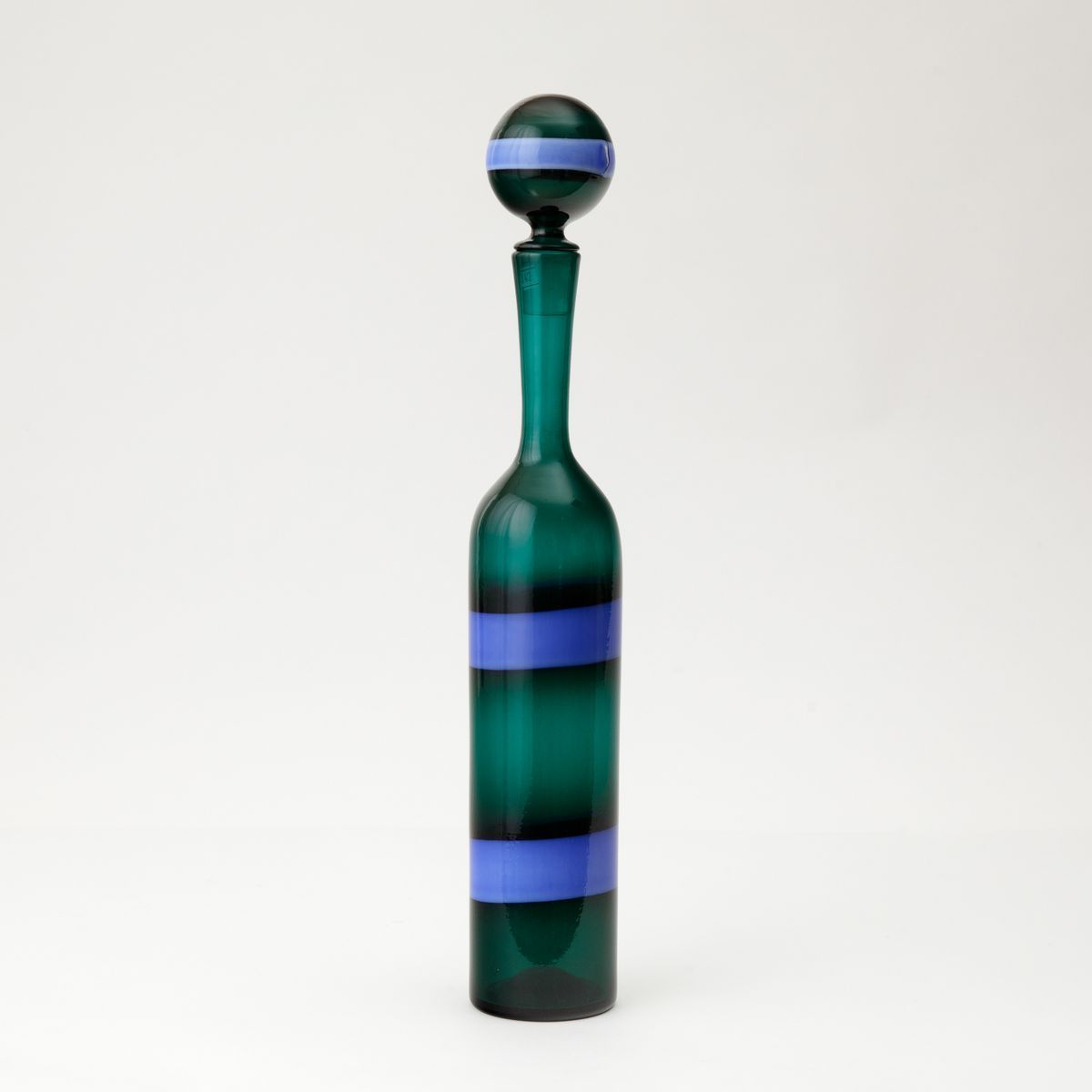 Fulvio Bianconi (1915-1996). A blown glass bottle with a spherical cap and a decor of blue bands. H 48cm. Acid-etched signature Venini Murano Italia.