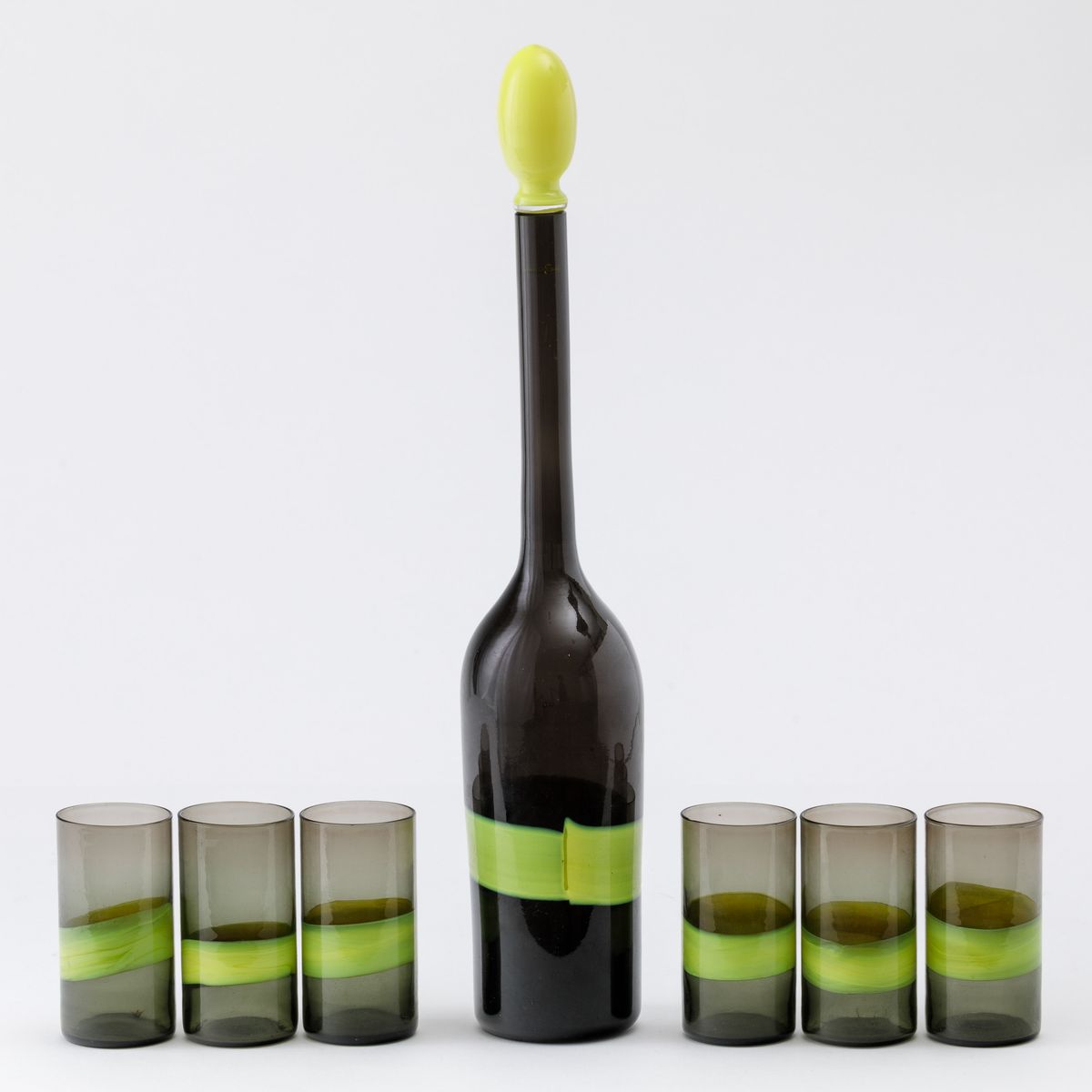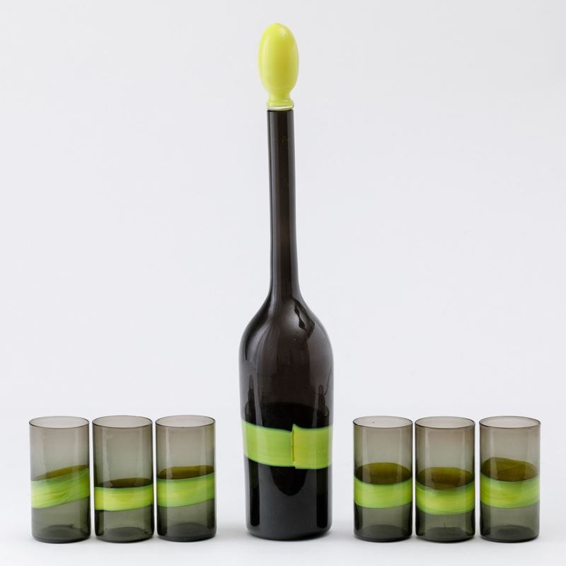 A smoked blown glass bottle and six glasses with a decor of sulphur-coloured bands. Bottle H 36cm, glasses H 8.5cm. Acid-etched signature Venini Murano Italia.
