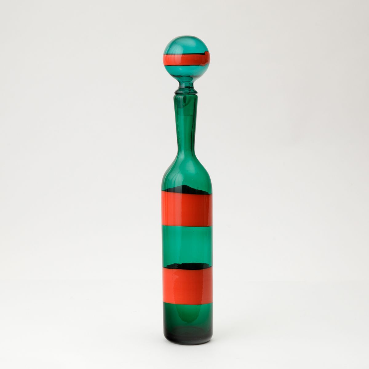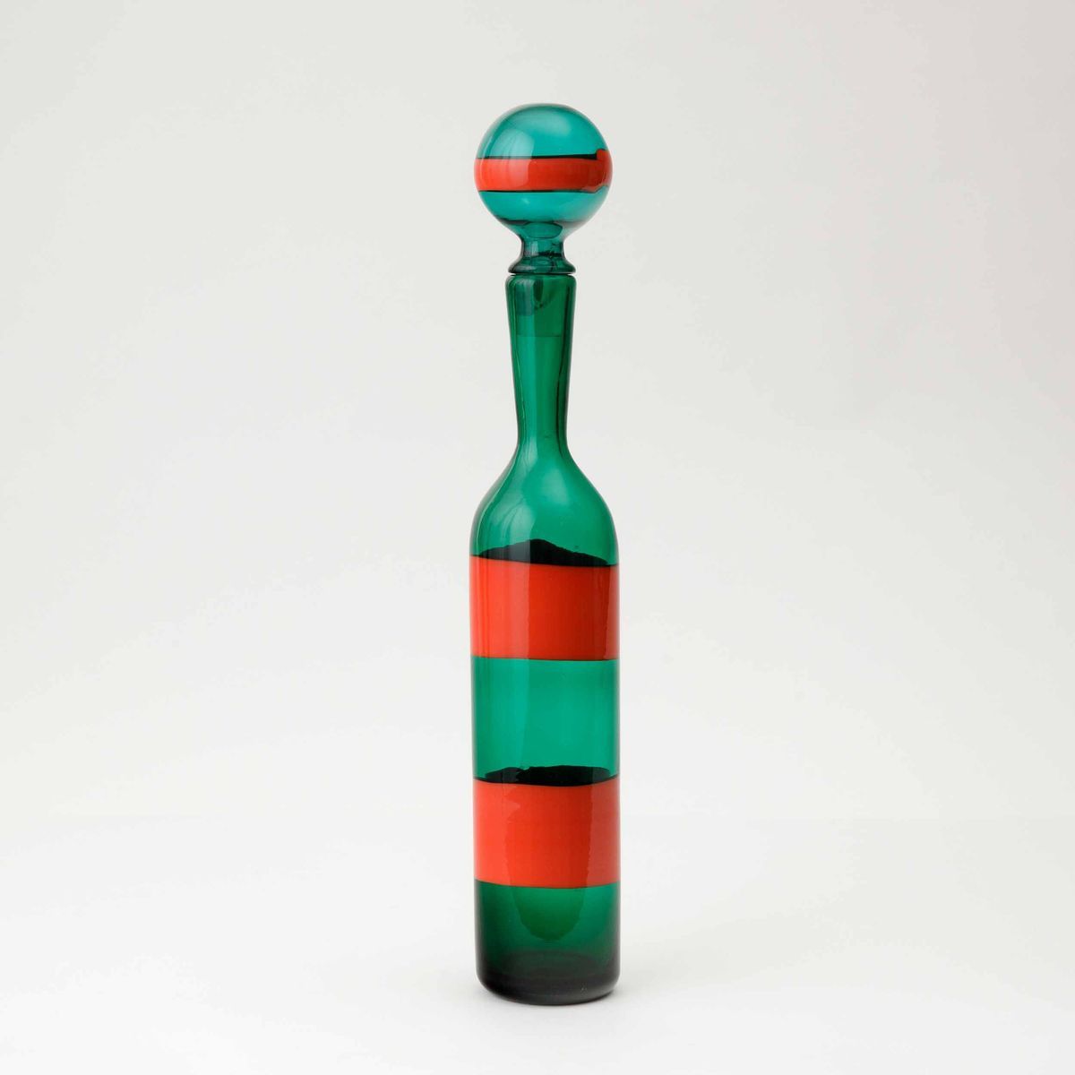 Fulvio Bianconi (1915-1996). A blown glass bottle with a spherical cap and a decor of coral red bands. H 47.5cm. Acid-etched signature Venini Murano Italia.