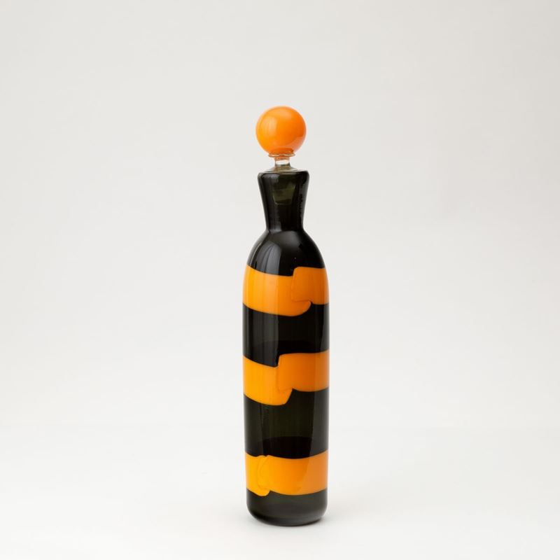 Fulvio Bianconi (1915-1996). A blown glass bottle with a spherical cap in taupe and orange. H 42.5cm. Acid-etched signature Venini Murano Italia.